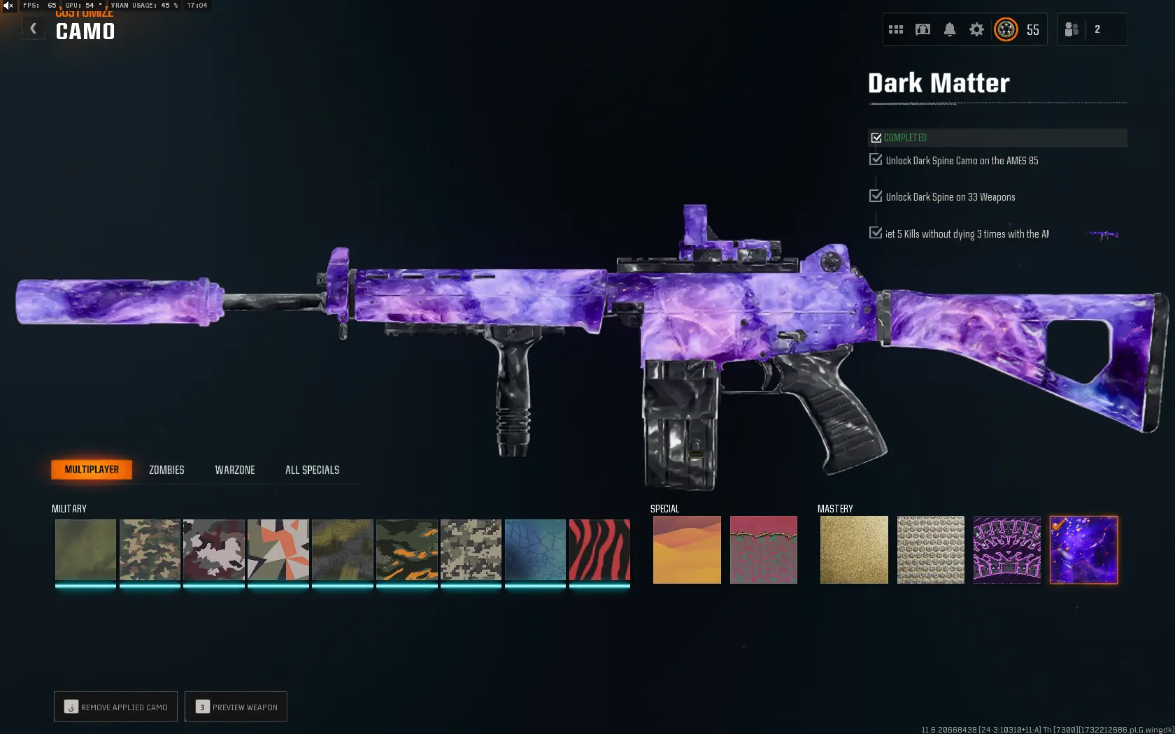 BO6 Dark Matter 33 legit 🐉 Level 55 Prestige 1 🥢 Diamond camo 🎩 Dark Spine 🐪 Gold camo 📡 Steam/PSN/Xbox/Bnet ✅ Full Access 🎐 Instant Delivery
