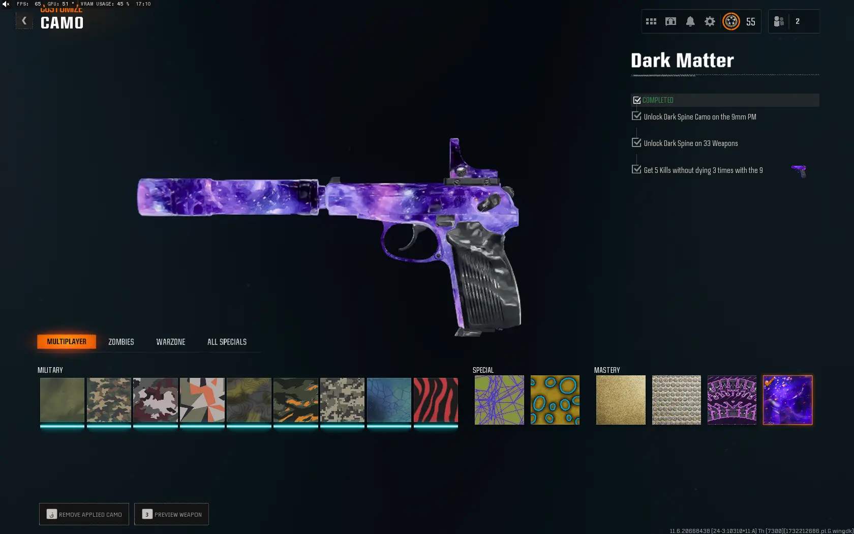 BO6 Dark Matter mastered 🦓 Level 55 Prestige 1 🎮 Diamond 🐸 Dark Spine 🪐 Gold 🧻 Works with Steam/PSN/Bnet/Xbox 🥌 Completely Legit 🎆 SaintStore Guarantee