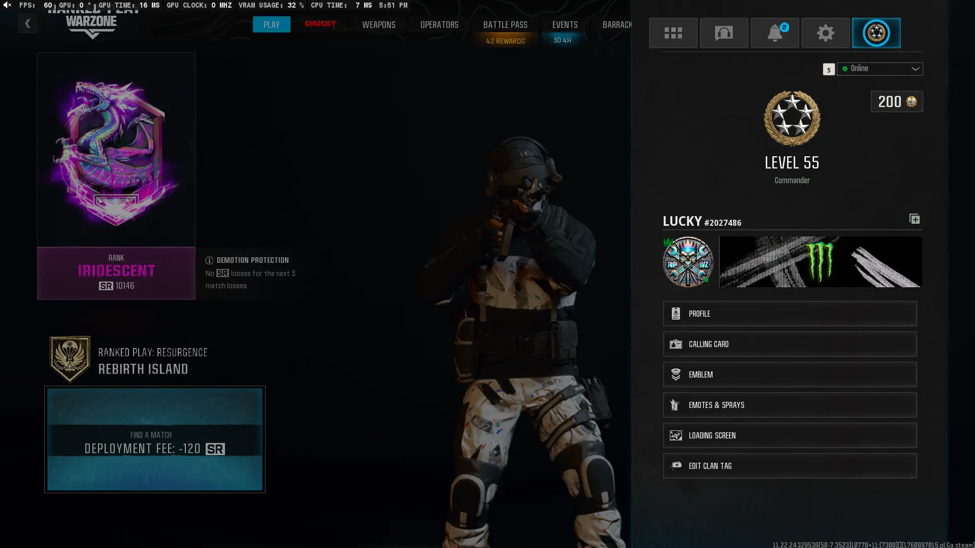 ✨ WZ4 Rebirth ✨ Iridescent Rank 💠 SR 10146 S6 🩵 Ranked Ops 💎 Full Access 💎 Warzone Resurgence Rebirth Iridescent 🔗 Linkable to: Steam, Battle.net, PSN, Xbox 🕹️ Warzone 4 iri