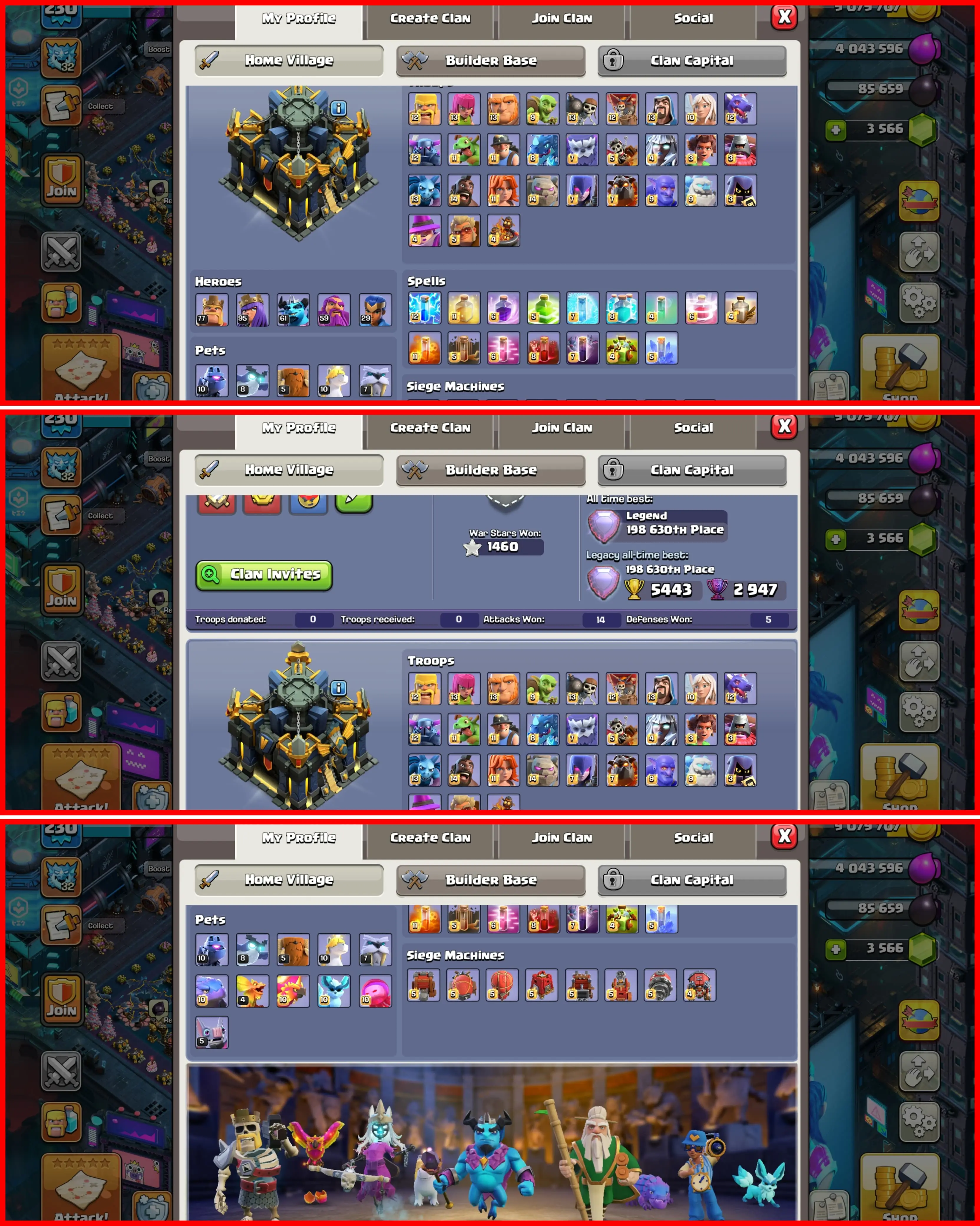 Max Th 17 | Full Fire Profile | Almost 6 Epic Eq Max | 3 Rare Paid Scenarys| All Walls Max | Dfnc Full Max | 500 Nc | BB Max | items n medels | Many Obstacles n Statutes | Fully Decorated All Corner | 42 Lvl Hayday Linked |