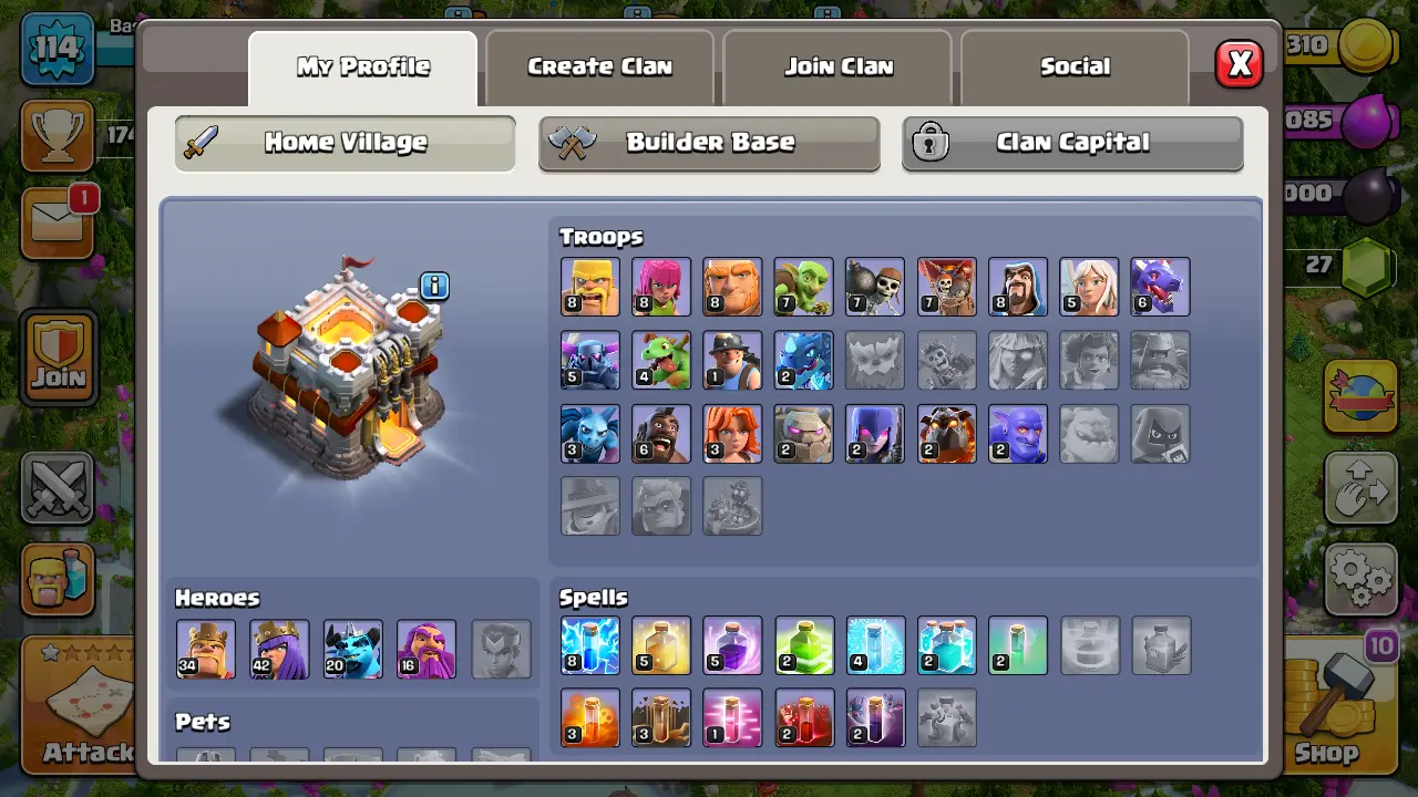✅ TH 11 ✅ LVL 114 🔰 HERO 34-42-20-16 🔰 WALL 10-11 LVL 🔰 1746 TROPHY 🔰 27 GEMS 🔰 CS319