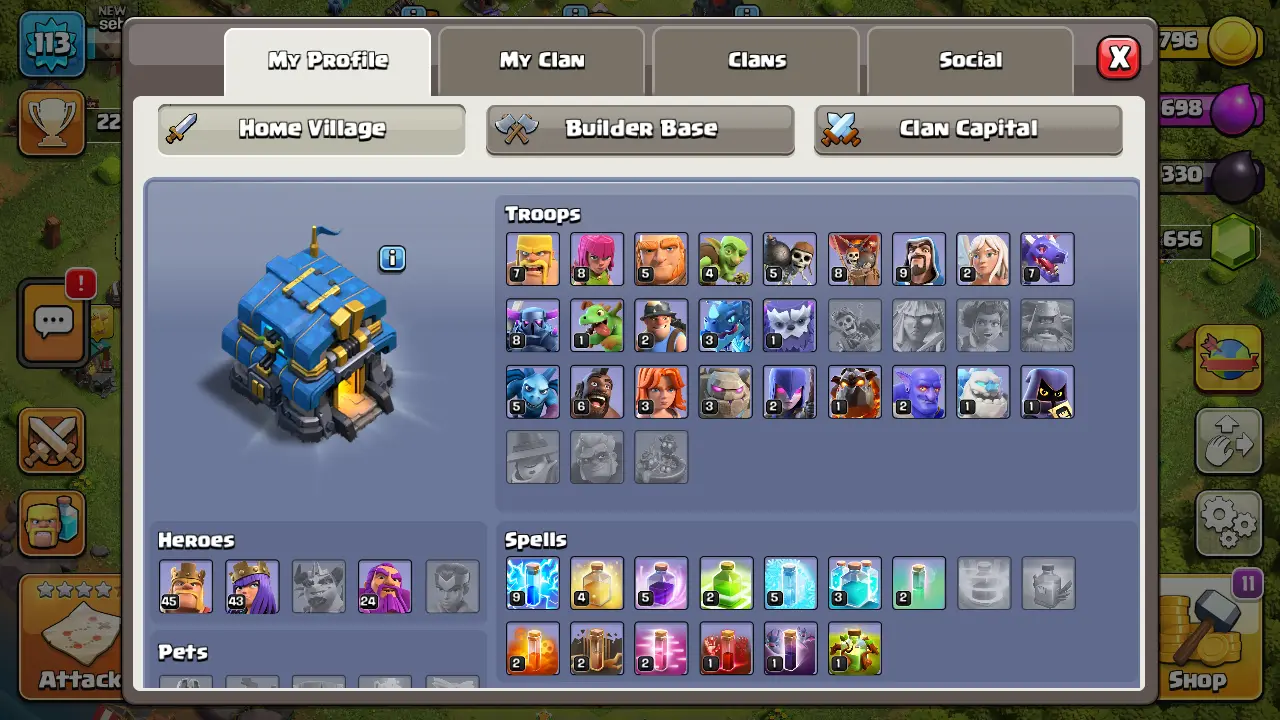 ✅ TH 12 ✅ LVL 113 🔰 HERO 45-43-24 🔰 WALL 9-11 LVL 🔰 2209 TROPHY 🔰 1656 GEMS 🔰 CS322