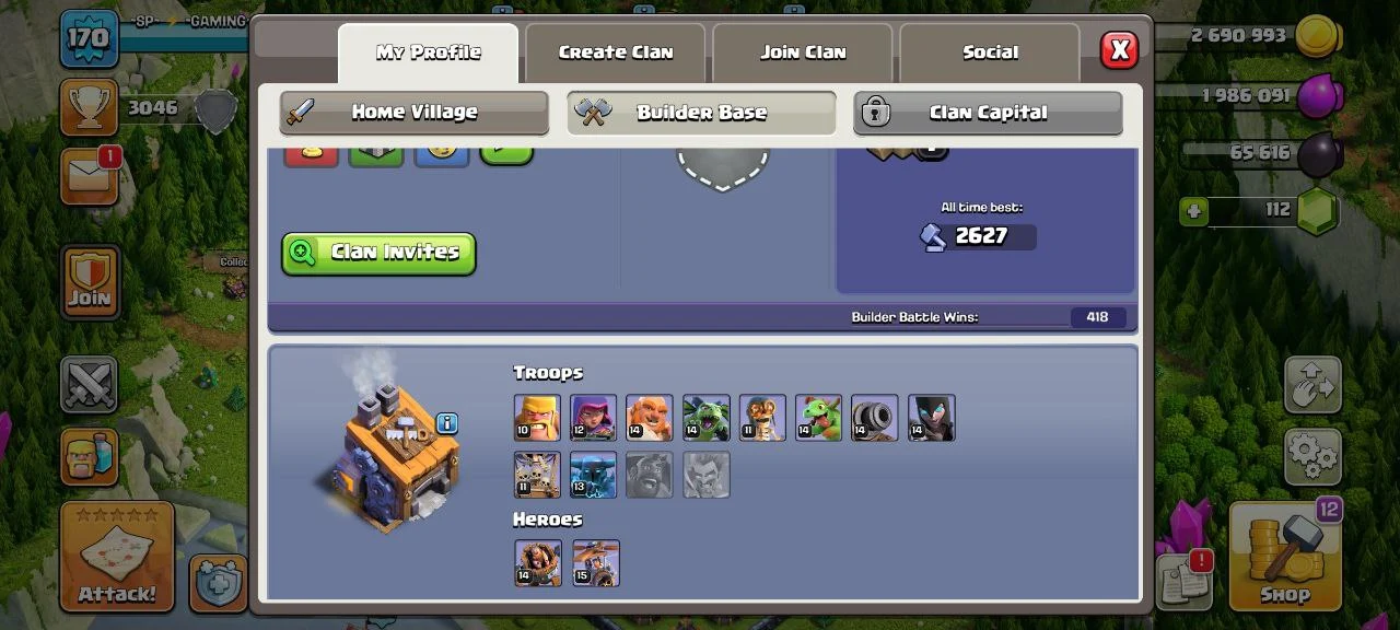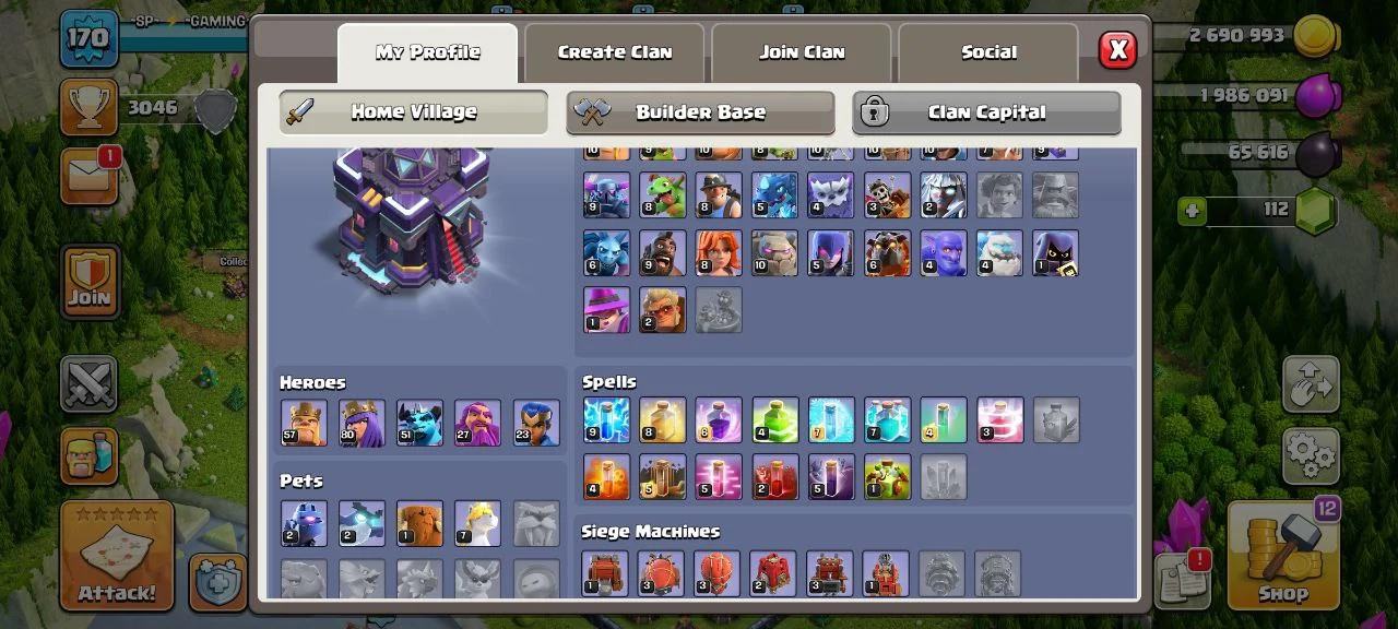 🏰 TH15 ⭕️ Semi Max ⭕️ 🎯 Heroes 57_80_51_23 + Pets ⭕️ 💎 112 Gems ⭕️ 📊 Lvl 170 ⭕️ 🏆 3046 Trophies ⭕️ ⚔️ BH9 | BM15 (3627 Best) ⭕️ 🏛️ Clan Capital ⭕️ 🚀 Siege Machines ⭕️ ✨ Hero Equip & Pets ⭕️ ⚡ Instant Delivery ⚡