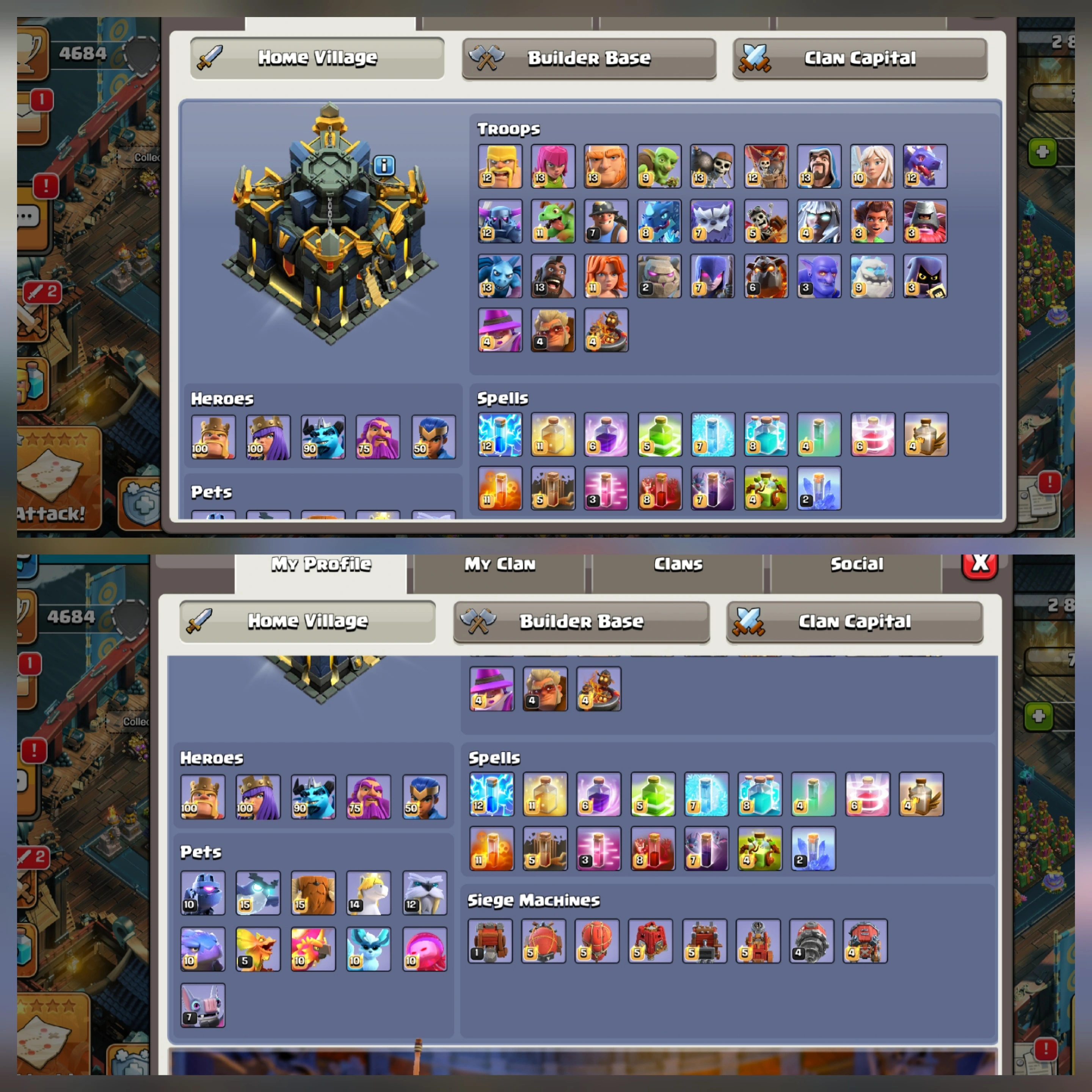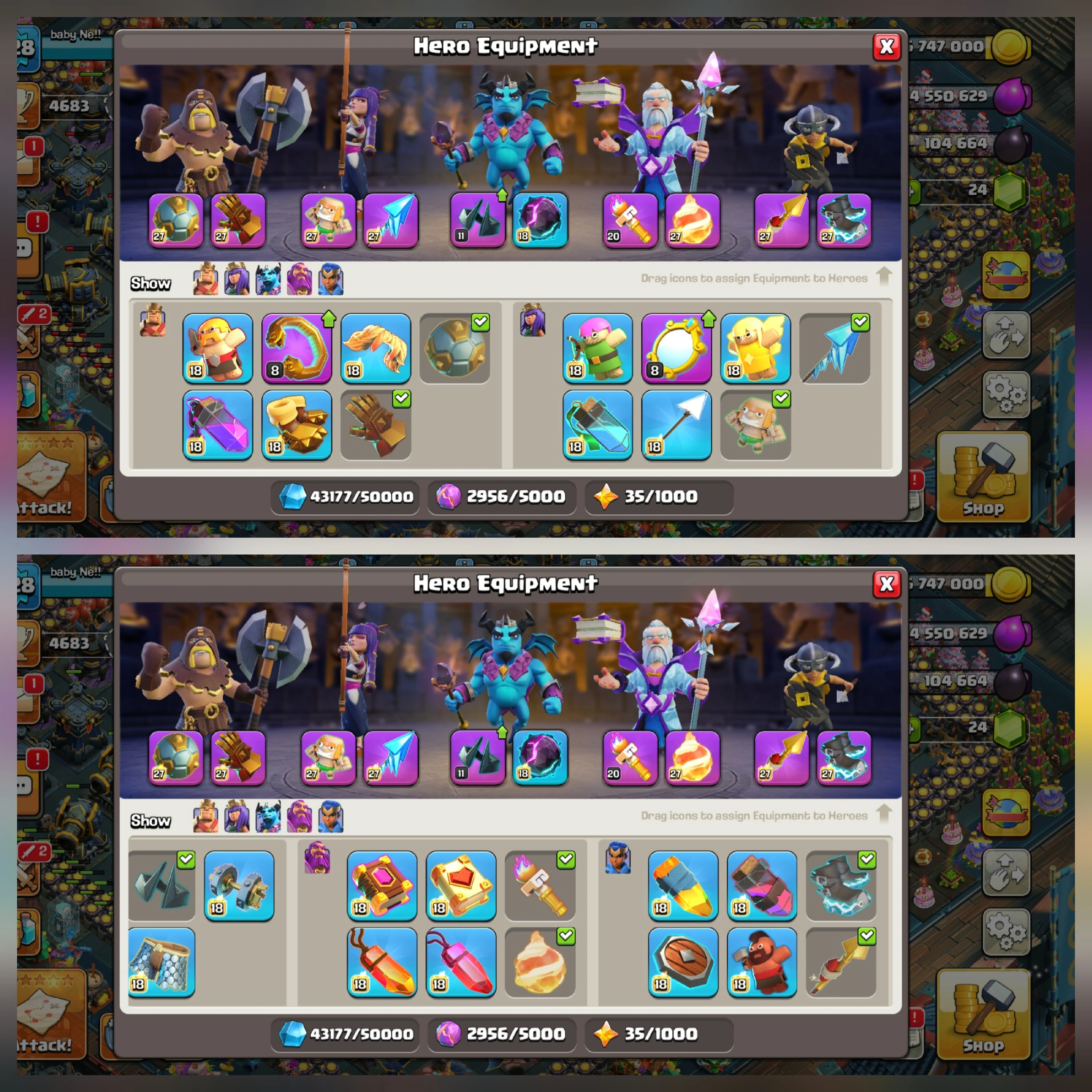 World rare 3 league hero skin ♤♤ th 17 <100%max acct> ♤7 epic equipment max ♤30+ equipment max ♤ nc 1000 gems ♤300 cwl madel ♤ 30 x hero skin also legendary 👏