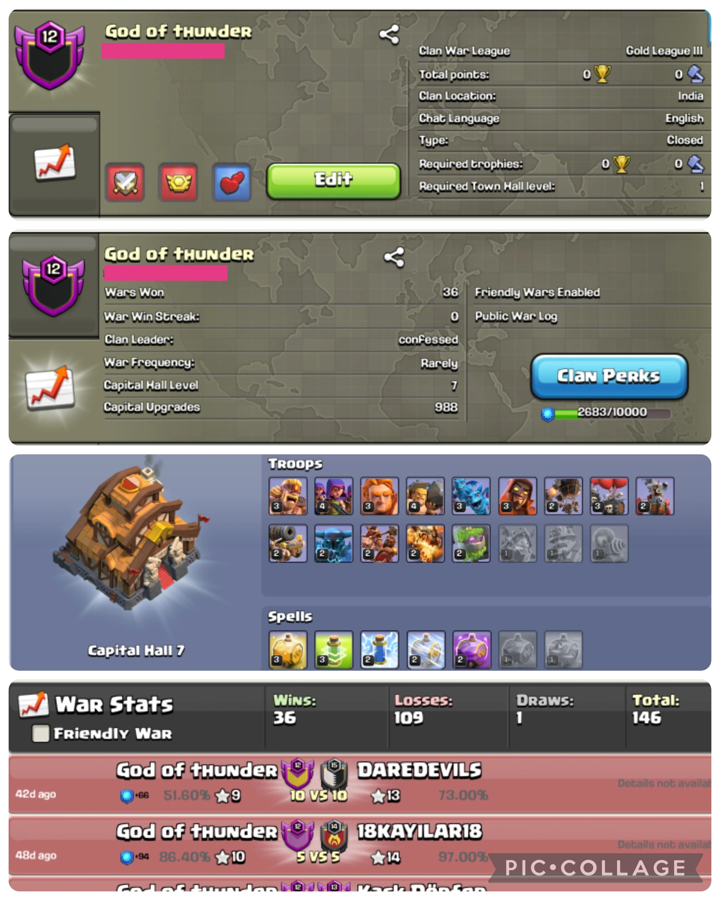 😻GOD OF THUNDER ⛈️ LEVEL 12 🌹 CLAN CAPITAL LEVEL 7 💥 36 WINS 109 LOSSES 1 DRAW 🕊