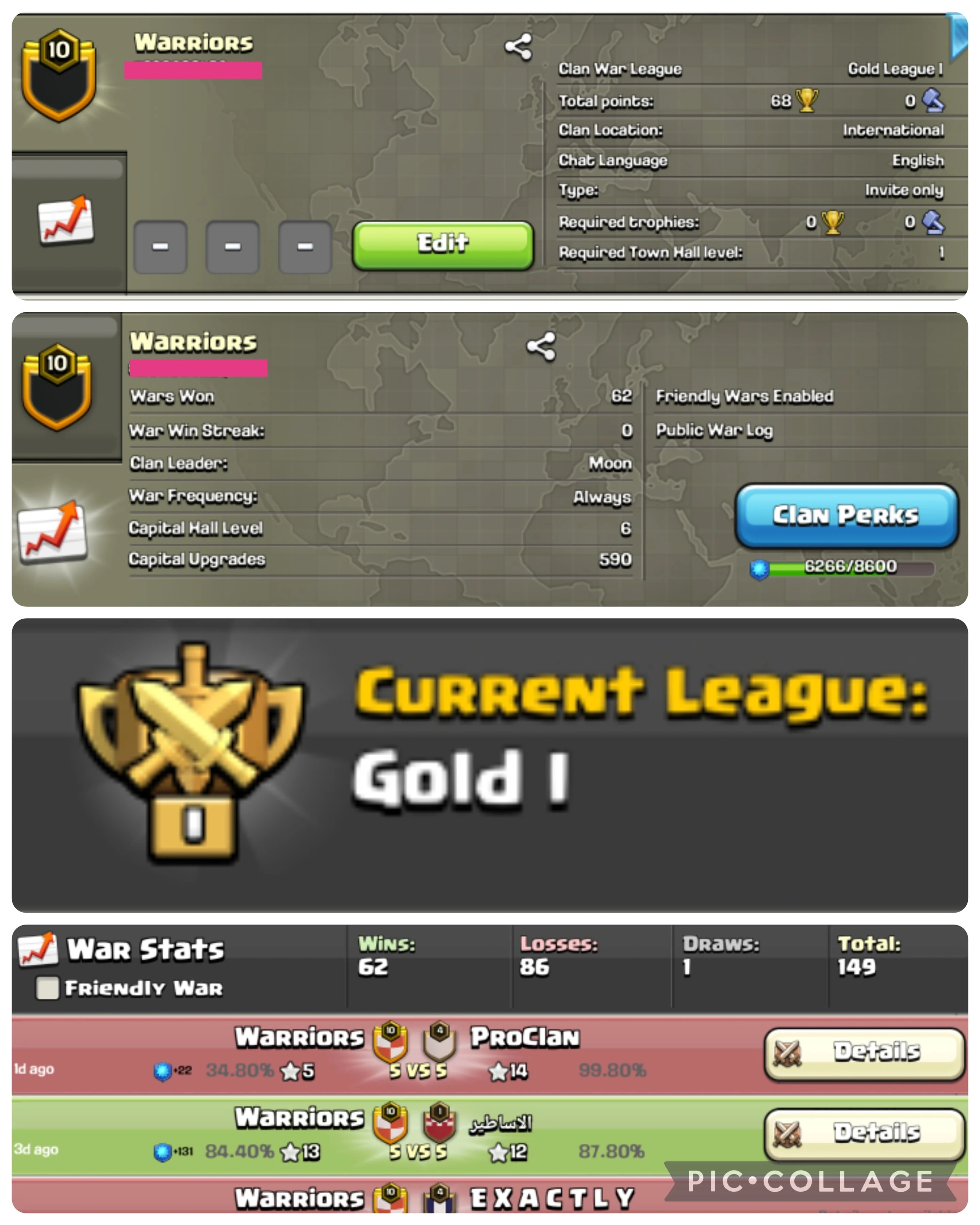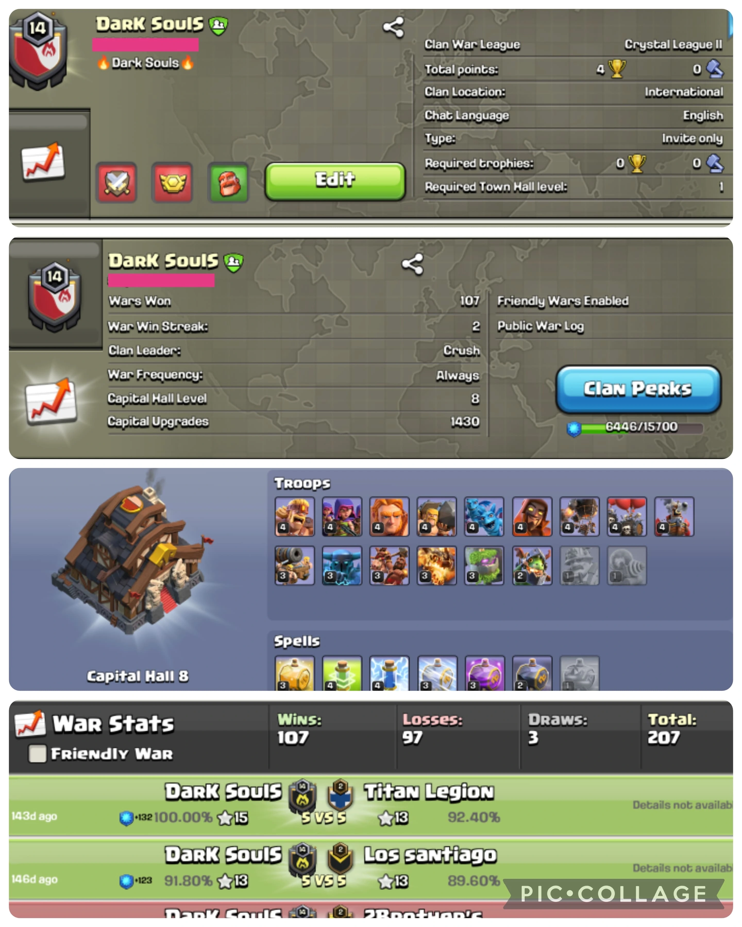 💥CRYSTAL 3 + CC 9 😋 SPARTANS 👅 LEVEL : 18 🕷 153 WINS 161 LOSSES 1 DRAWS 😝