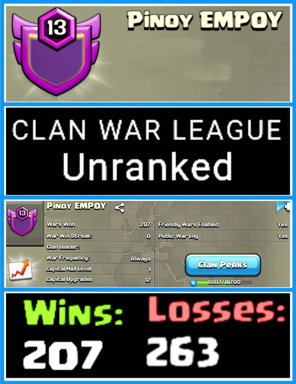 💥CRAZY PRICE💥 🔥OP LEVEL 13 ENGLISH CLAN ❤ NICE NAME : PINOY EMPOY 🌀 LEAUGE : UNRANKED 💢 CLAN CAPITAL : 1💧WINS : 207 | LOSS : 263 🔻 BEST CLAN BUY NOW 🌪️ FAST DELIVERY
