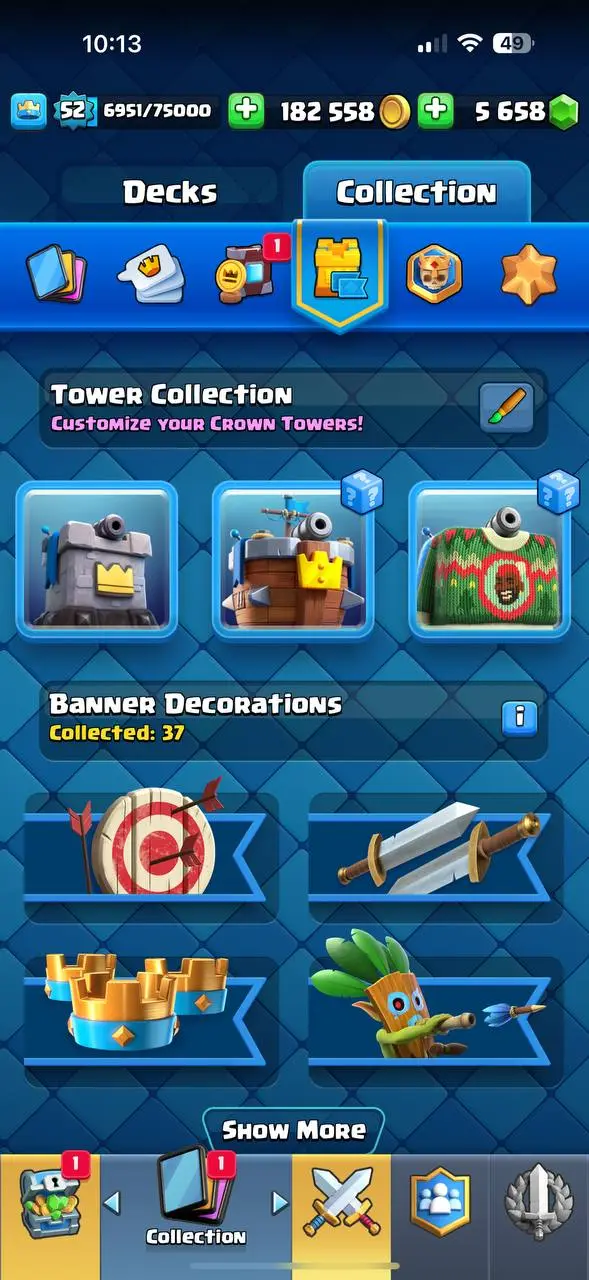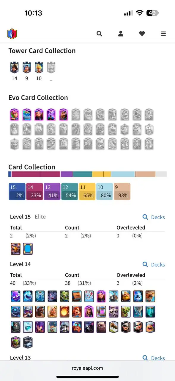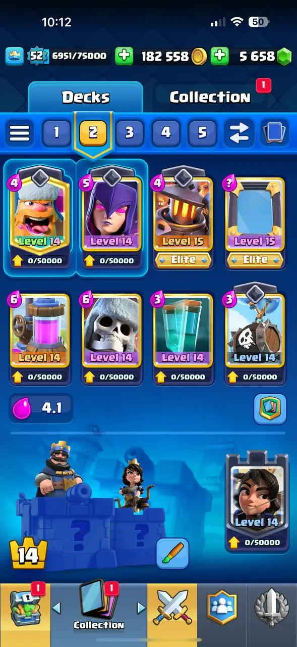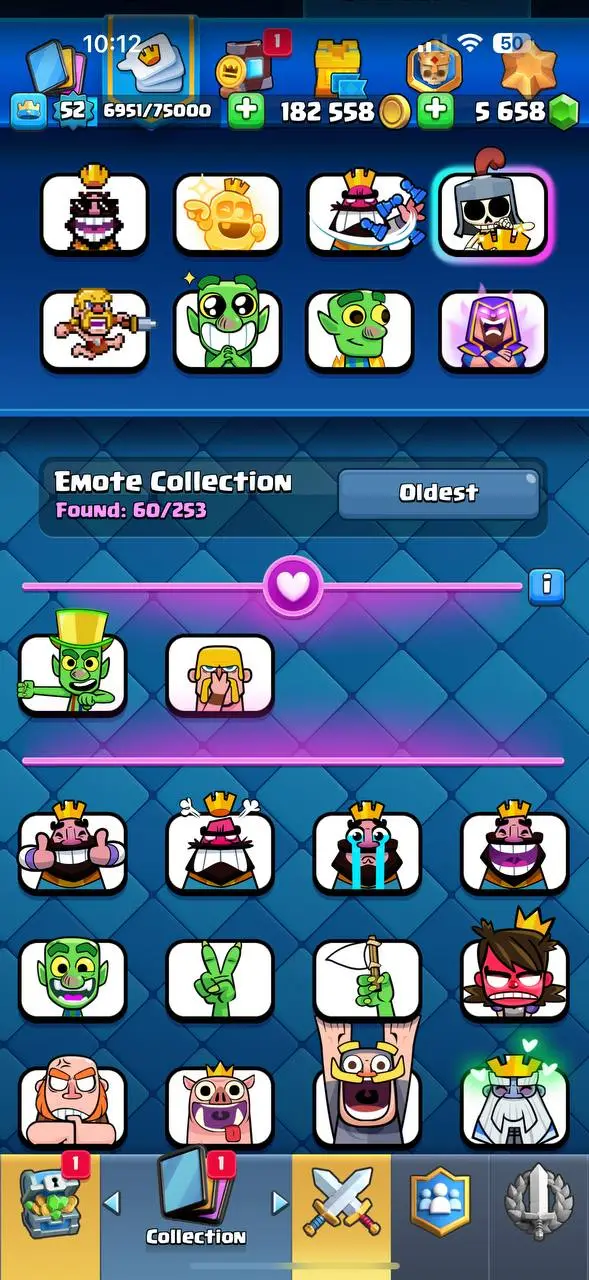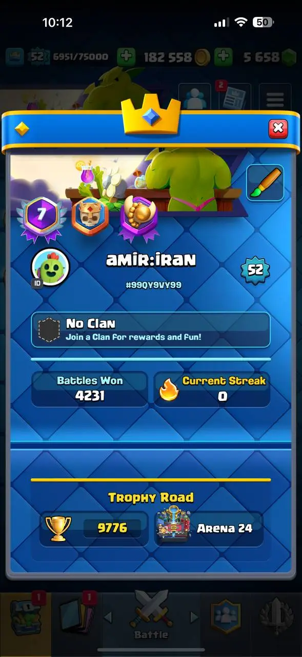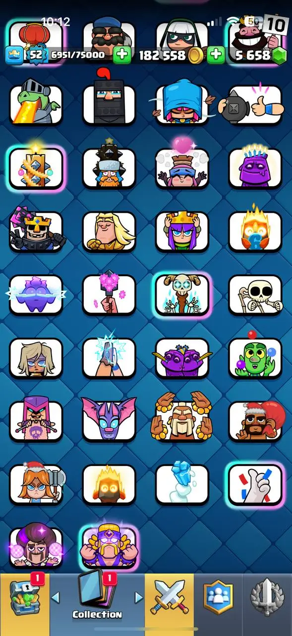0p 💥 40 MAX CARDS 🔹 ARENA 24 ⚔️ 2 ELITES 🔹 5 EVO 🏆 9776 TROPHIES 📈 XP52 🏰 KT14 💎 5658 GEMS 😀 60 EMOTES 🎖️ 7 YEAR BADGE ⚡ INSTANT