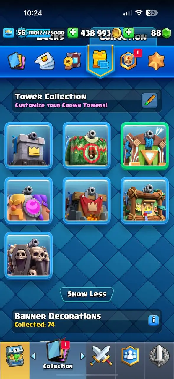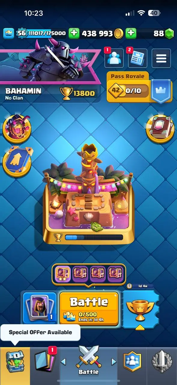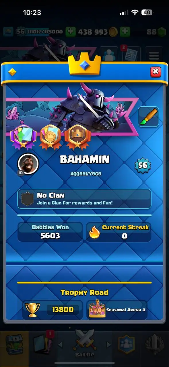 0p💎 PREMIUM 💥 SKINS 7 🔥 MAX 51 ⚔️ ARENA 24 💪 10 ELITES ⚡️ 11 EVO 🏆 13800 TROPHIES 🎯 XP56 🏰 KT15 😎 126 EMOTES ⚡️ INSTANT