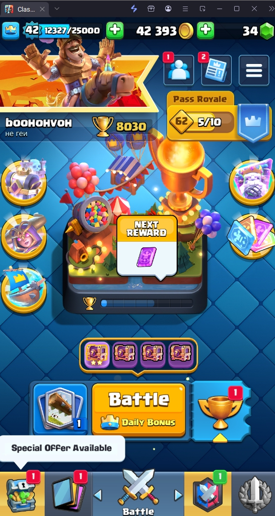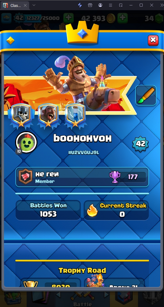 8030 TROPHY 🏆 42 LVL 💯 KT 14 👑 120 CARDS ♦️ 8 MAX CARDS 👑 1 ELITE CARDS  🔮 6 EVO 💯 EMOTE 37 🎭 #U2VVGUJ9L ⸱ TAG ACCOUNT ♥️