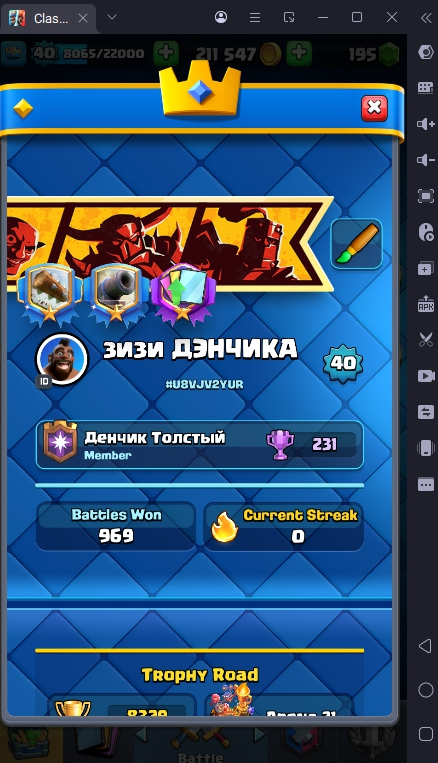 8329 TROPHY 🏆 40 LVL 💯 KT 13 👑 116 CARDS ♦️ 7 MAX CARDS 👑 0 ELITE CARDS 🔮 3 EVO 💯 EMOTE 29 🎭 #U8VJV2YUR ⸱ TAG ACCOUNT ♥️