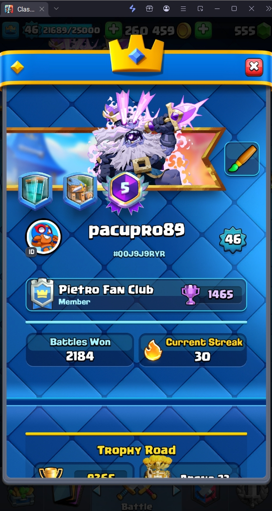 9365 TROPHIES 🏆 46 LVL 💯 KT 14 👑 120 CARDS ♦️ 5 MAX CARDS 👑 1 ELITE CARDS 🔮 8 EVO 💎 EMOTE 37 🎭 #Q0J9J9RYR ⸱ TAG ACCOUNT ⚙️ LEGENDARY ARENA • 9000 TROPHIES 💎