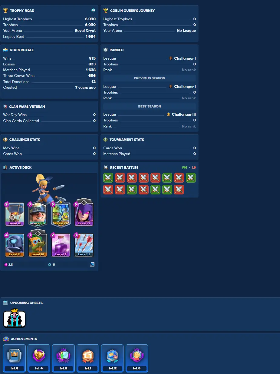 KT 12 LEVEL 35+Trophies:6030+815 WINS+7 YEARS OLD+2 Evolution+114 Cards+3 Cards (13LVL)+5 Tower Skins+21 Emotes+464K Gold+598 Gems+IOS/ANDROID