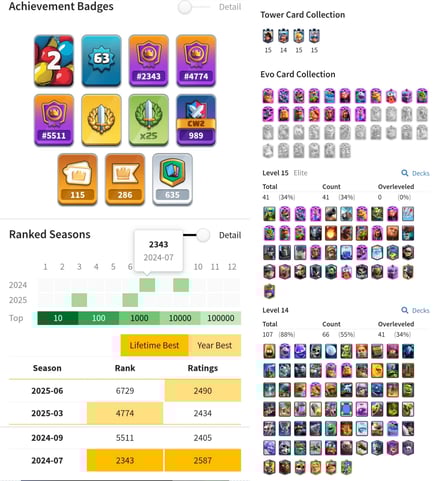 ⭐ KT 15 ⭐ 60 EXP ⭐ 16 EVOLUTION ⭐ 24 ELITE & 61 MAX CARD ⭐ 10800 TROPHY ⭐ 103 EMOTES ⭐ 8 TOWERSKINS ⭐ MAGIC ITEMS ⭐ NAMECHANGE 500 ⭐ 4700 GEMS