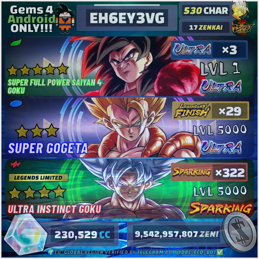 👑 WHALE Legends Collection: [📱 Platform: Android, 👤 Characters: 514, 🌟 Ultra: 3, ⚔️ Sparking: 307, 💎 Crystals: 230529, 👑 Limited: 22, ⚡ Zenkai: 16] ⸱ PREMIUM COLLECTION | GUARANTEED SAFE !AGG02344