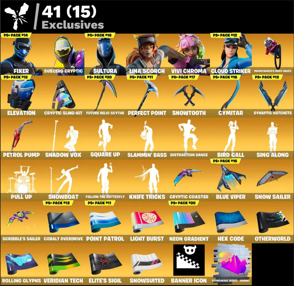 104 skins ⸱ For all platforms, Fixer | Subzero Cryptic | Sultura | Lina Scorch | Vivi Chroma | Cloud Striker | The Origin | Predator | The Flash | Professor Slurpo | The Imagined | Joltara | Son Goku