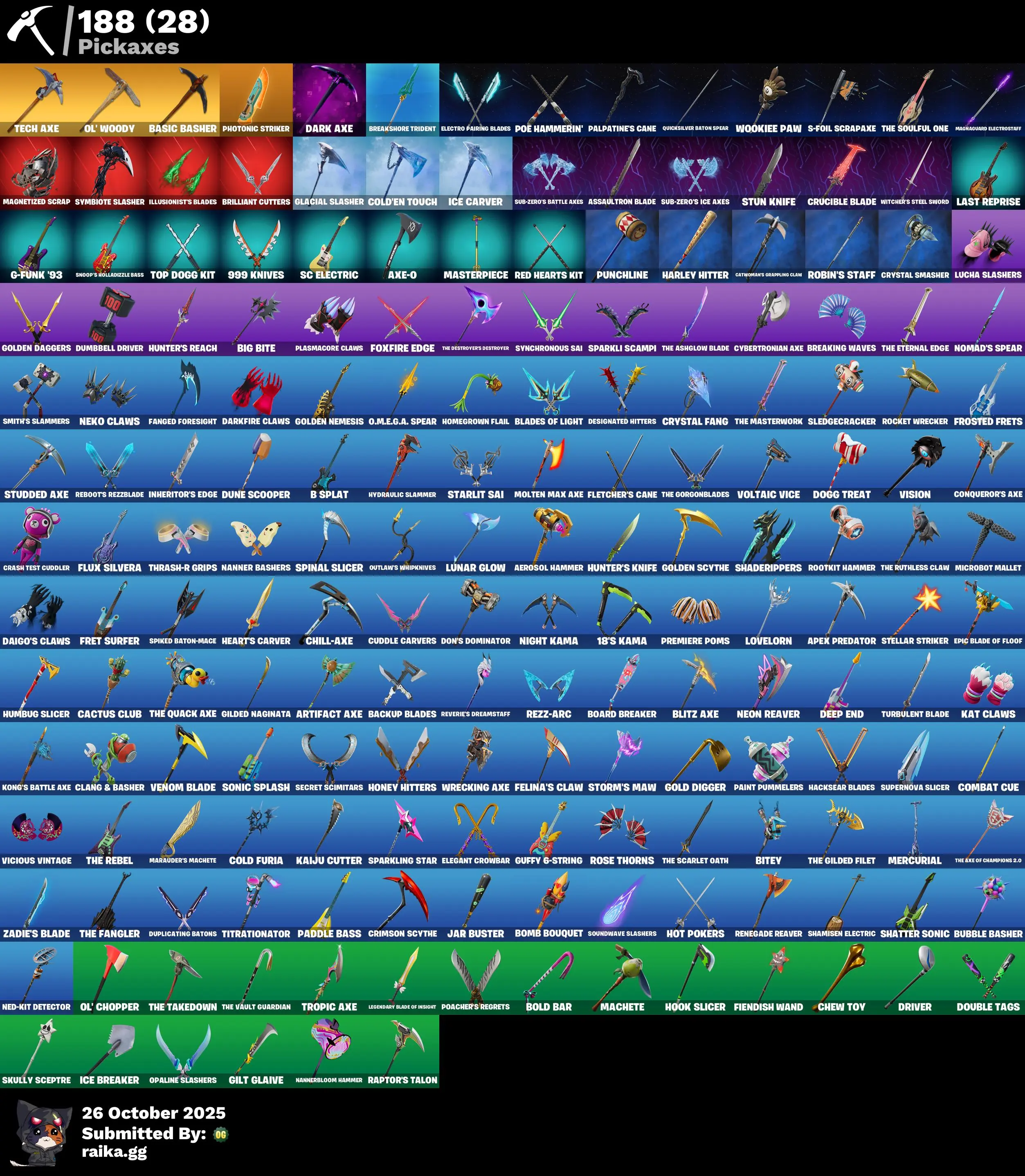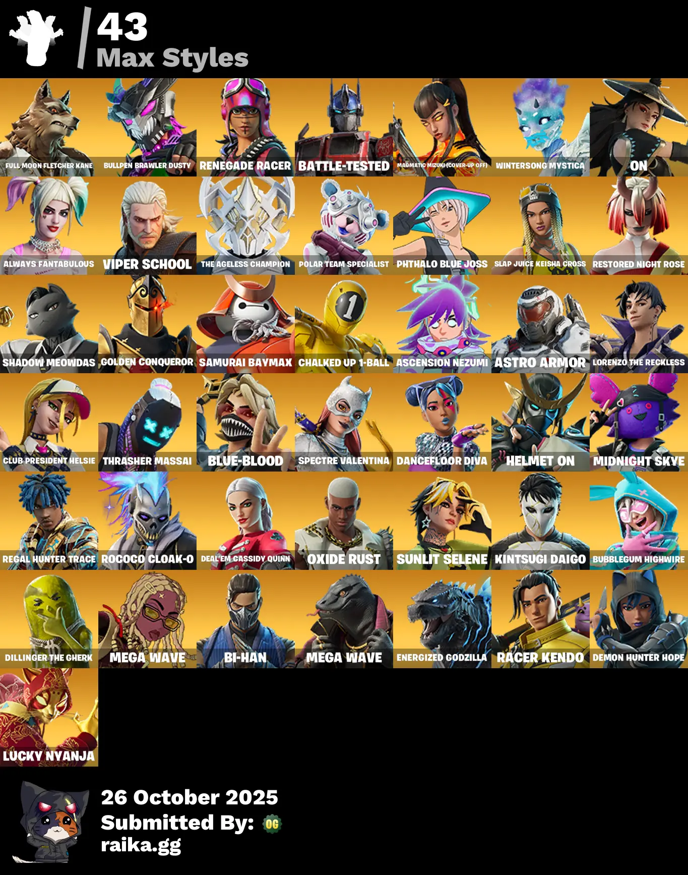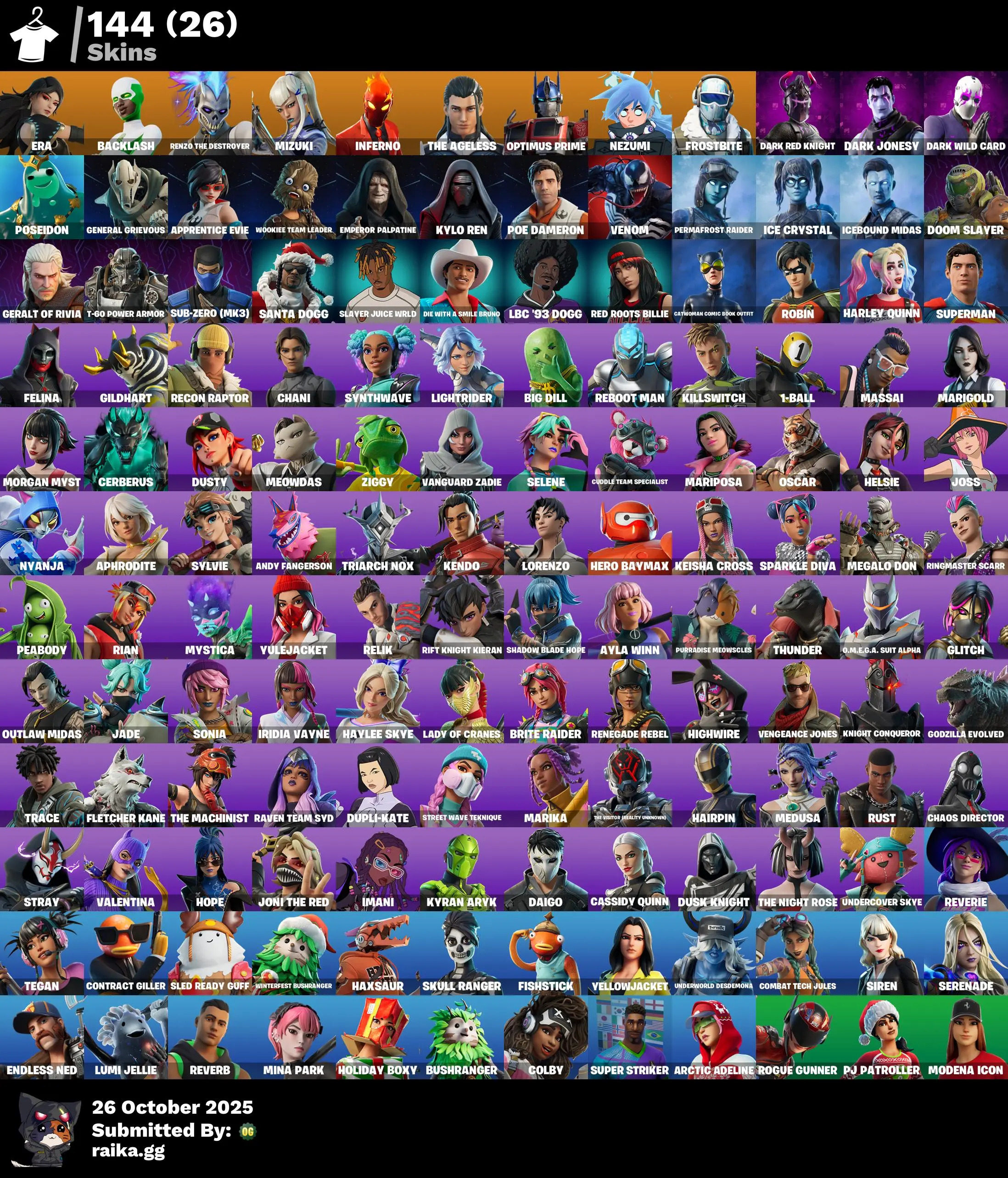 144 skins | General Grievous🎃Jungle Pod🎃Poe Dameron🎃Ol' Woody🎃Dark Wild Card🎃Kylo R🎃Dark Red Knight🎃Era🎃Optimus Prime🎃Tech Axe🎃Renzo the Destroyer🎃The Ageless🎃Inferno🎃Frostbite🎃Nezumi🎃Apprentice Evie🎃Mizuki🎃Backlash🎃Basic Basher D4509