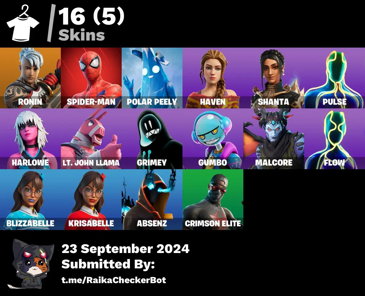🔥16 Skins 🔥PC/PSN/XBOX🔥 Ronin 🔥 Spider-Man 🔥 Polar Peely 🔥 Haven 🔥 Shanta 🔥 Pulse 🔥 Harlowe 🔥 Lt. John Llama 🔥 Grimey 🔥 Gumbo 🔥 Malcore 🔥 Flow 🔥