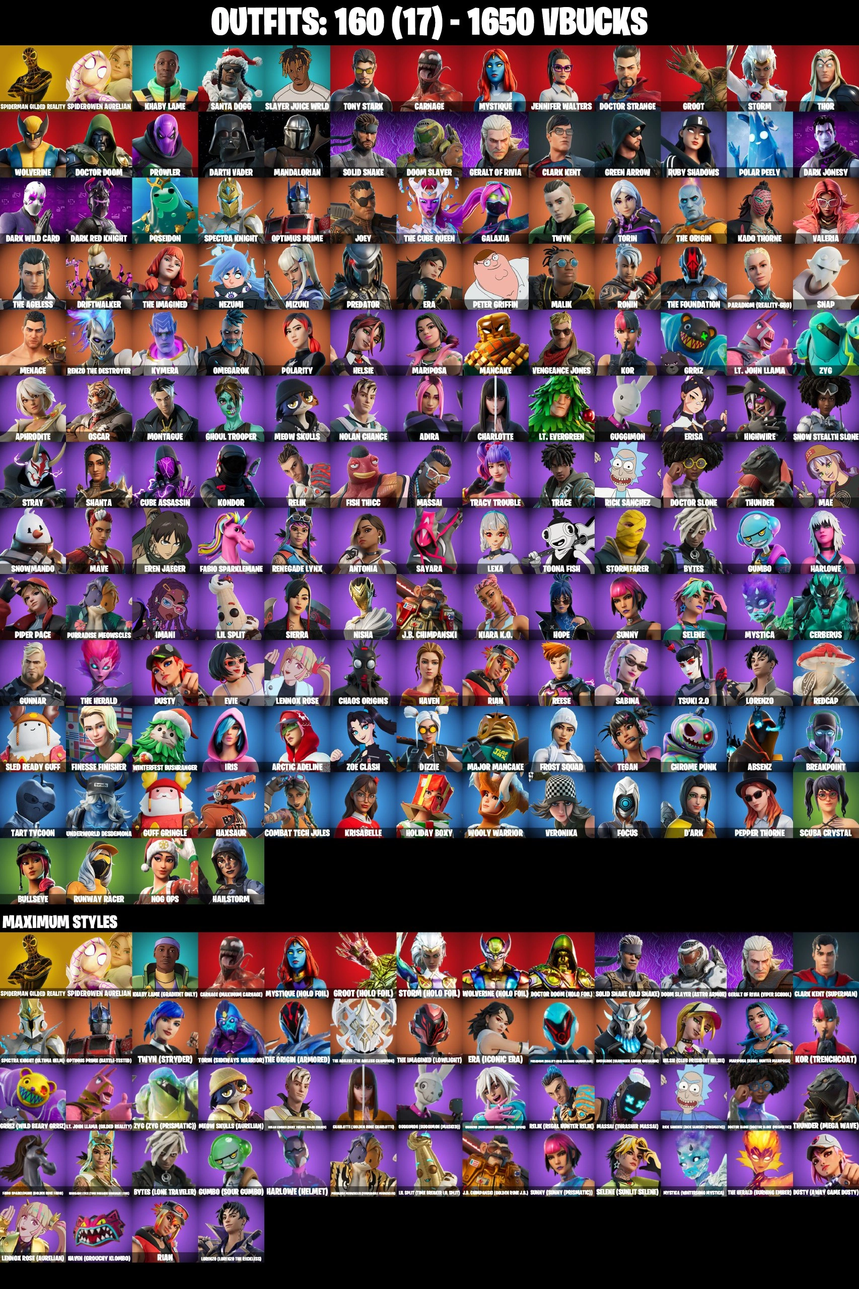 160 SKINS | FULL HOLO FOIL MARVEL | RUSHIN AROUND | GET GRIDDY | TRACY TROUBLE | POLARITY | GHOUL TROOPER | MANDALORIAN | GILDED SPIDER-MAN | SPIDER-GWEN STACY | LAUGH IT UP | BTS EMOTE | GALAXIA | PREDATOR | ERA MAX | MYSTICA MAX