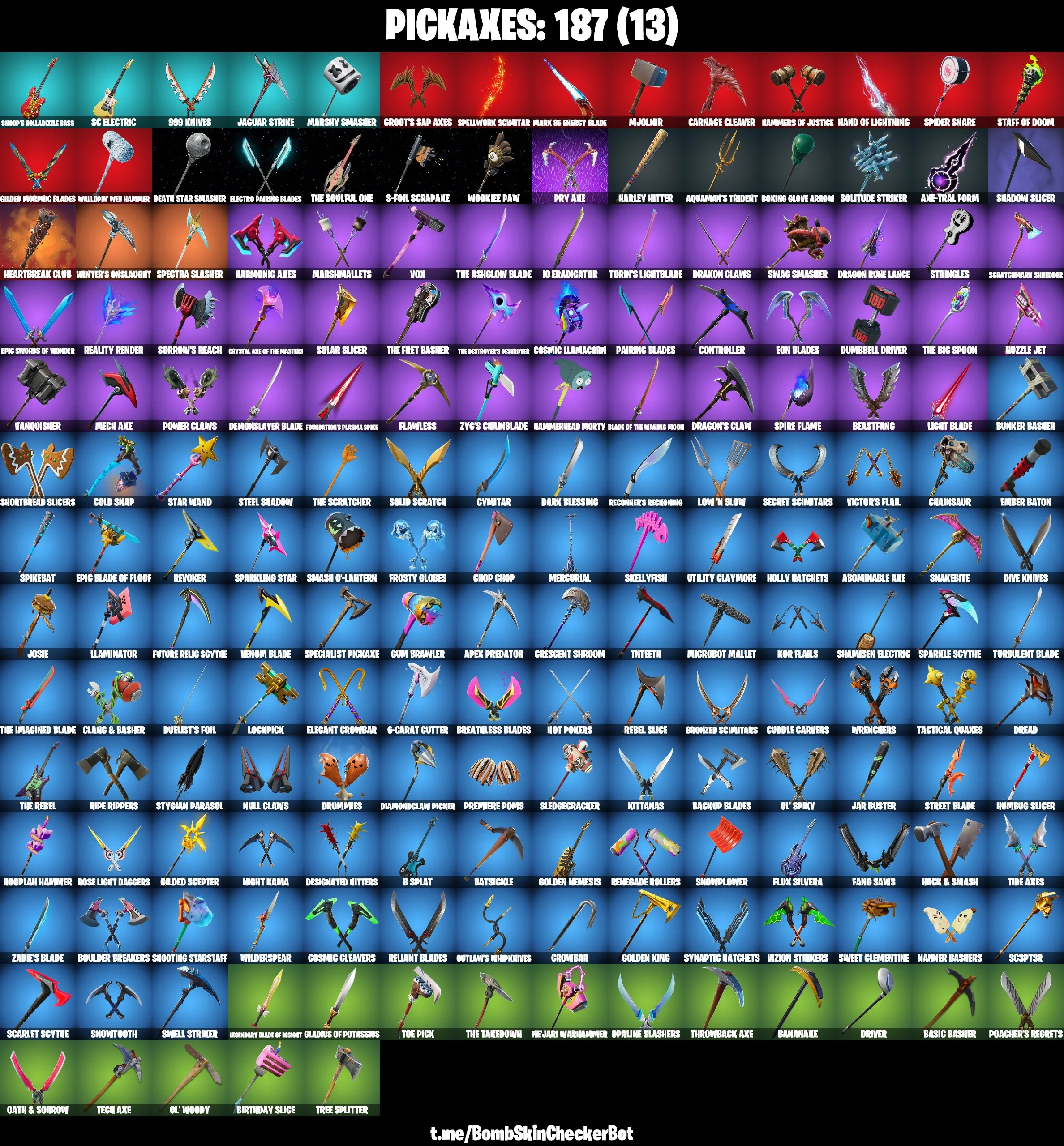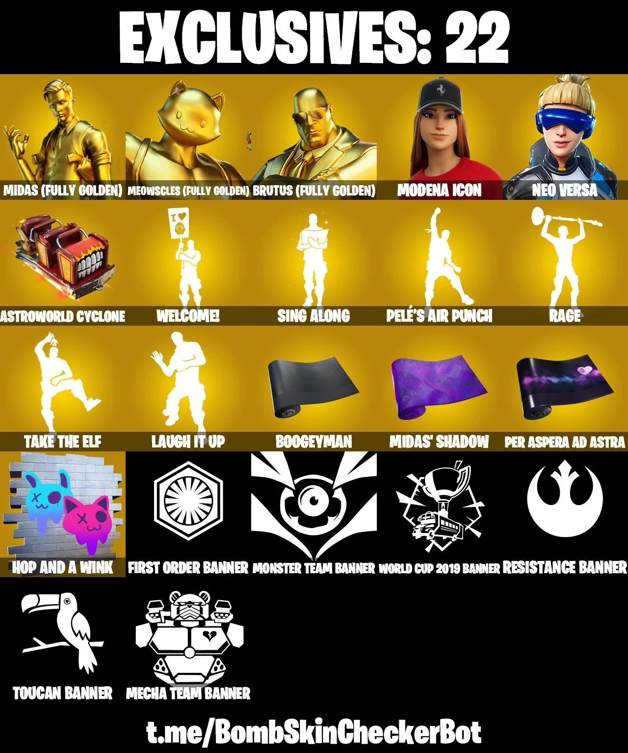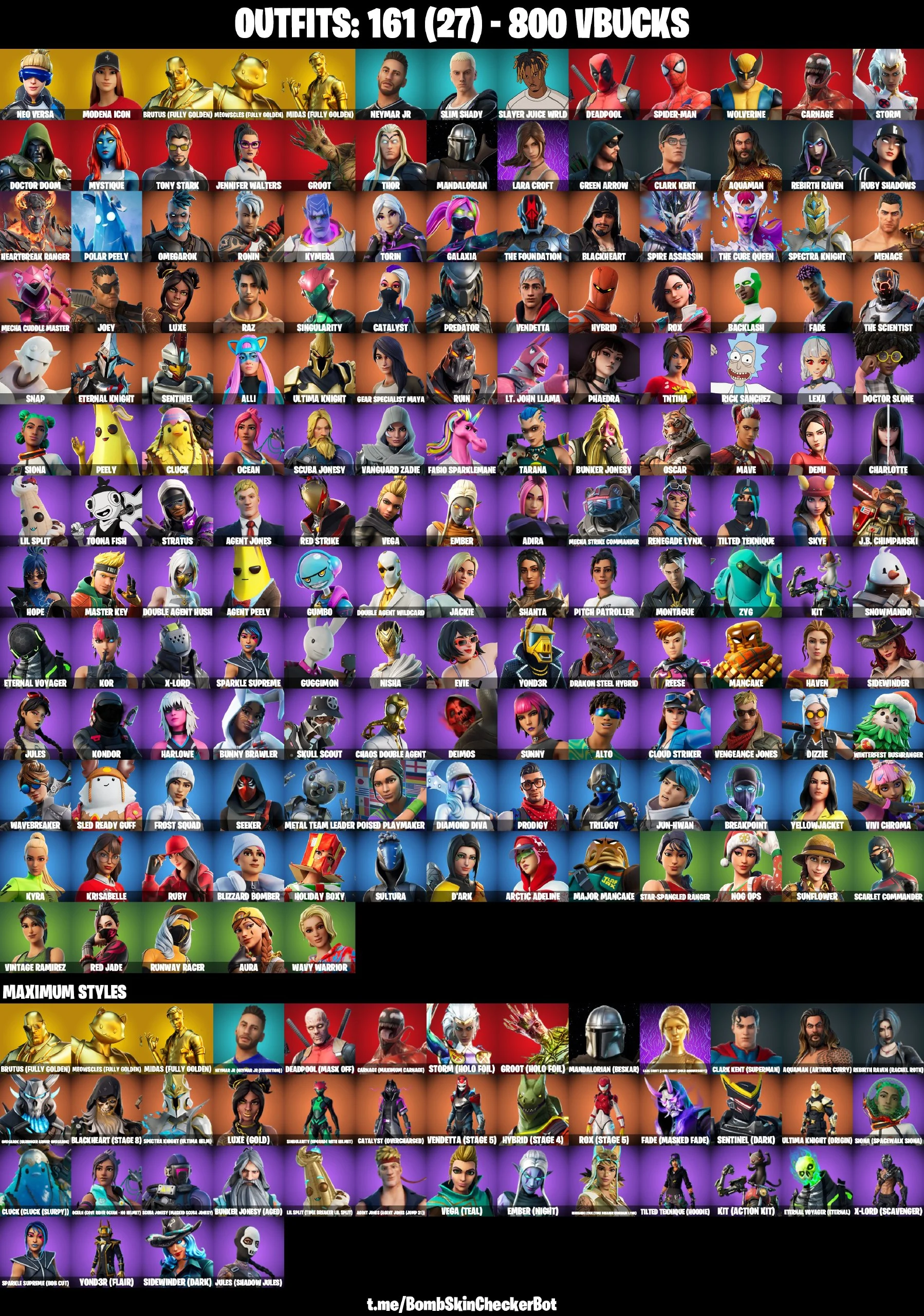 🔮161 Skins🔮 Rage💎Neo Versa💎Midas (Fully Golden)💎Laugh It Up💎Pele's Air Punch💎Take The Elf💎Galaxia💎Star Wand💎Harley Hitter💎Tony Stark💎Backlash💎Lara Croft💎Neymar Jr💎Crowba