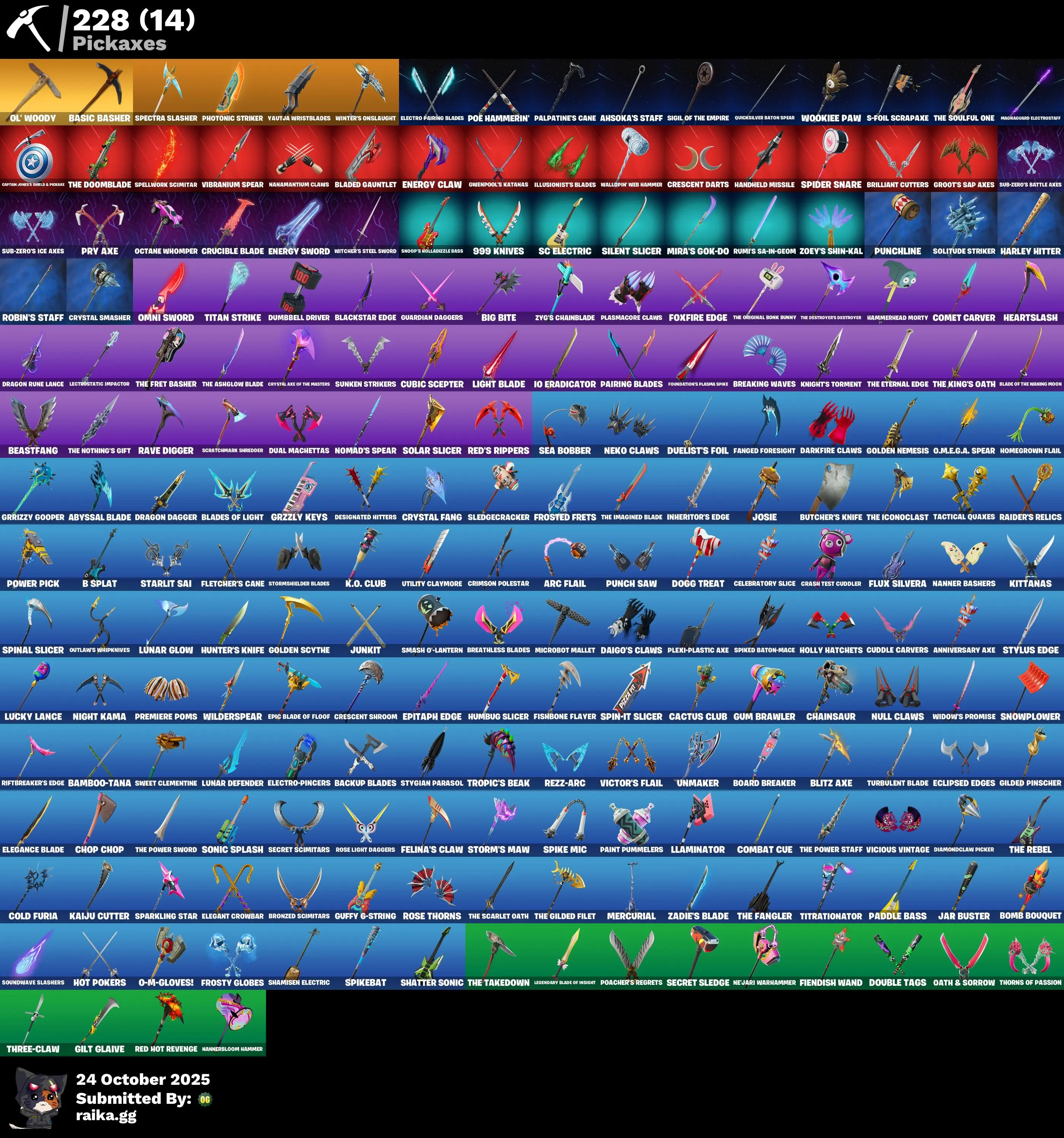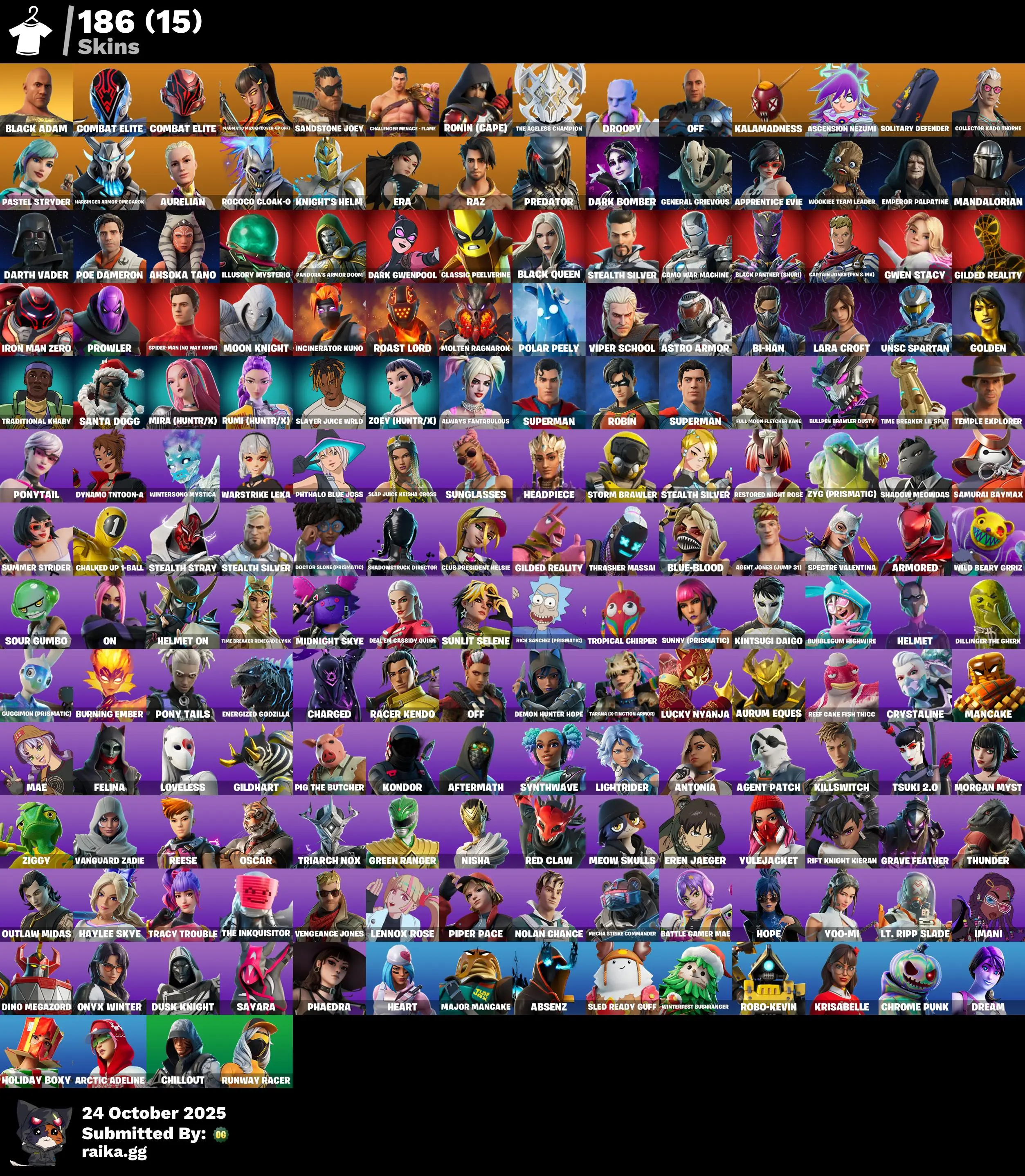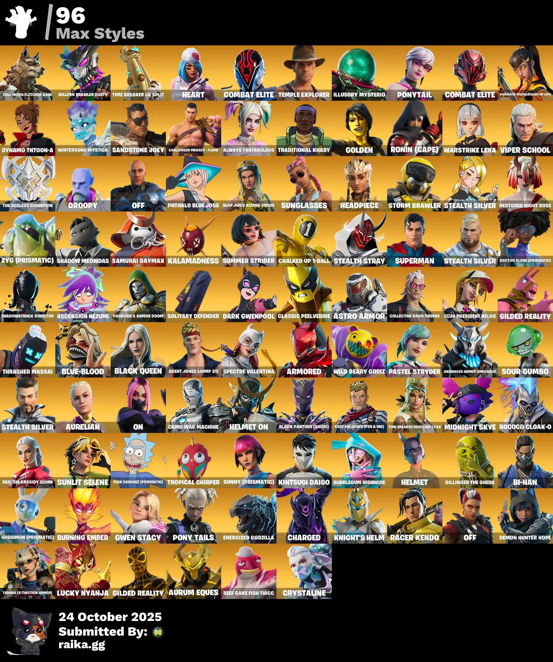 182 skins | The Foundation🎃Kado Thorne🎃The Origin🎃Ronin🎃Renzo the Destroyer🎃Black Adam🎃Raz🎃Omegarok🎃The Imagined🎃Era🎃Dark Bomber🎃The Ageless🎃Mizuki🎃Twyn🎃Paradigm (Reality-659)🎃Menace🎃Joey🎃Predator🎃Nezumi🎃Malik🎃Spectra Knight D5183