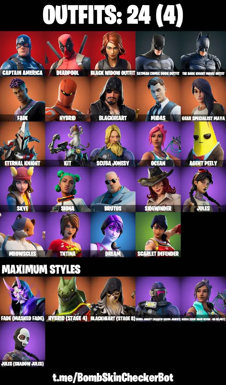 24 Skins✅ Jules, Black Widow, Siona, Ocean✅ 350 Vbucks✅ Mail Changeable✅ PC/PSN/XBOX✅