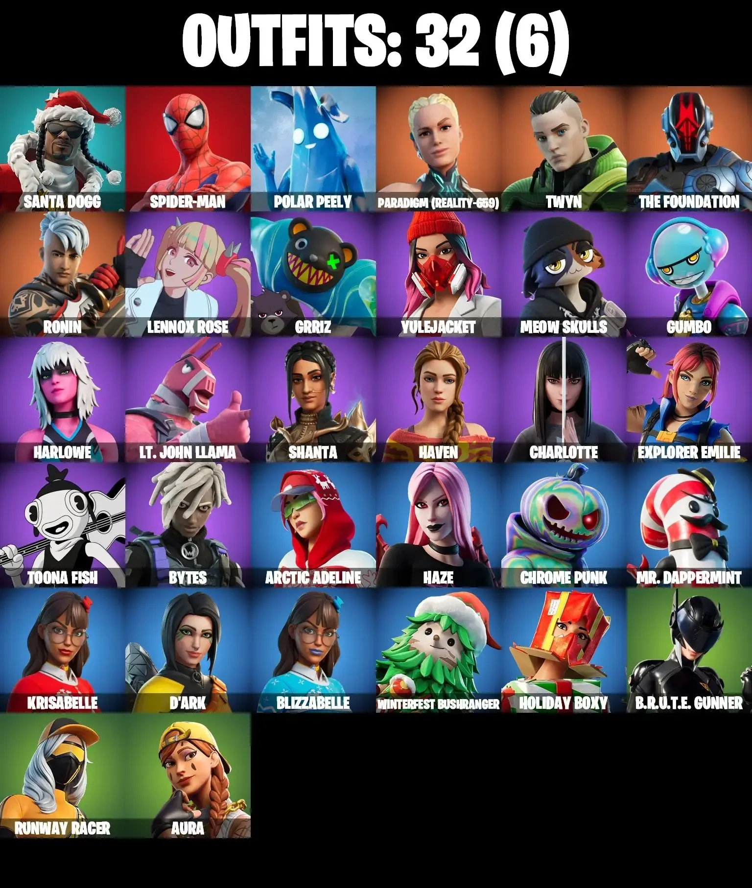 32 SKINS | SPIDER-MAN | JABBA SWITCHWAY | GET GRIDDY | CHARLOTTE | AURA | MEOW SKULLS | TOONA FISH | BYTES | BRUTE GUNNER | CAN PLAY ON PSN,XBOX,PC,NINTENDO,MOBILE | 100 VBUCKS | FULL EMAIL ACCESS