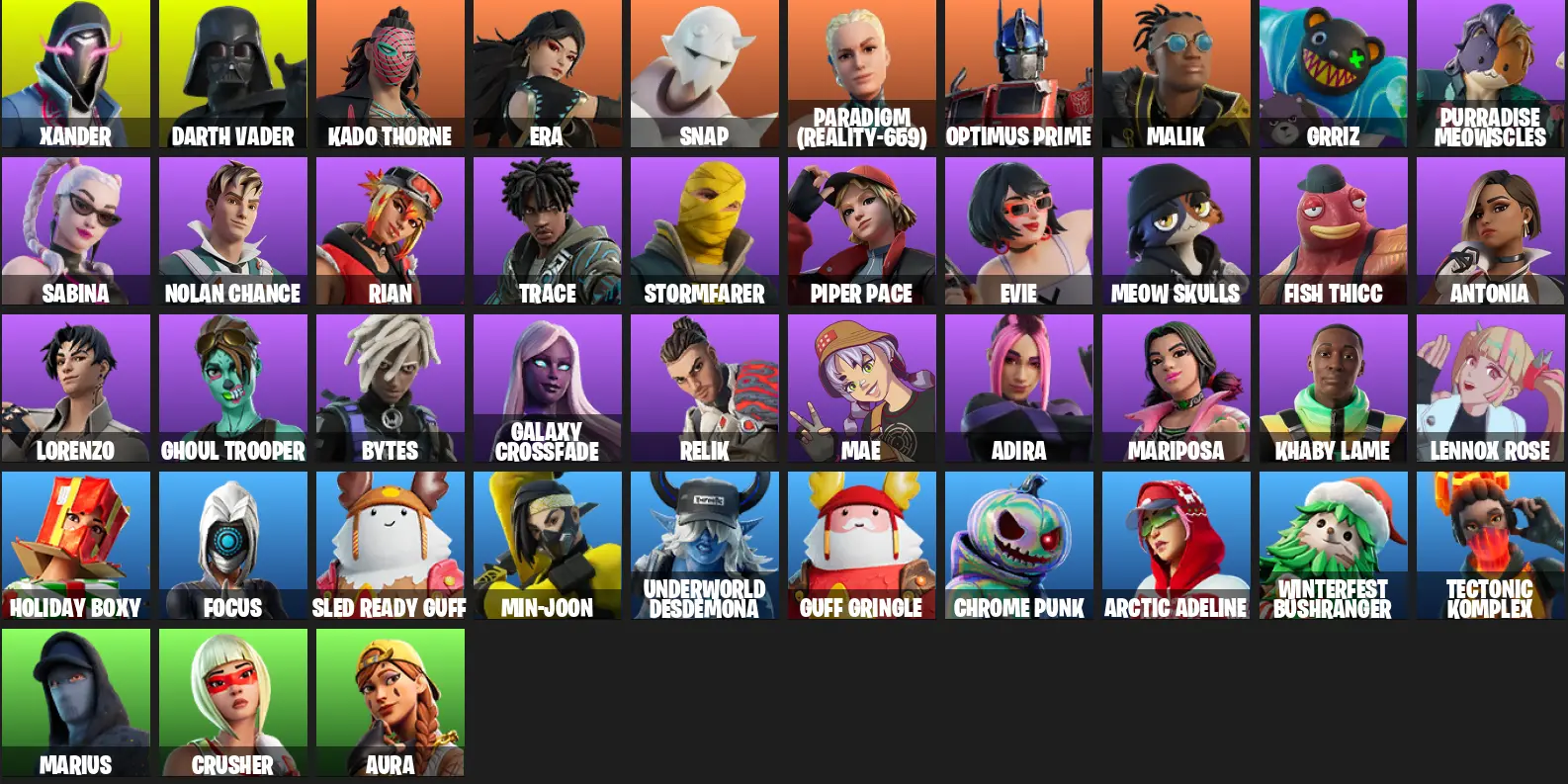 43 skins | Optimus Prime | Kado Thorne | Era | Paradigm (Reality-659) | Snap | Malik | Darth Vader | Tectonic Komplex | Khaby Lame | Fish Thicc