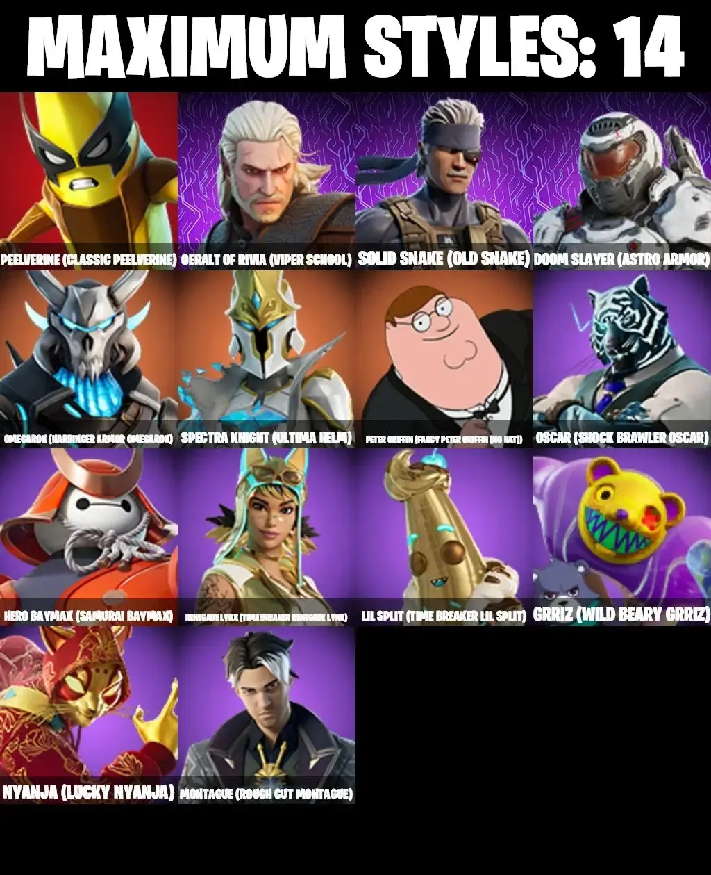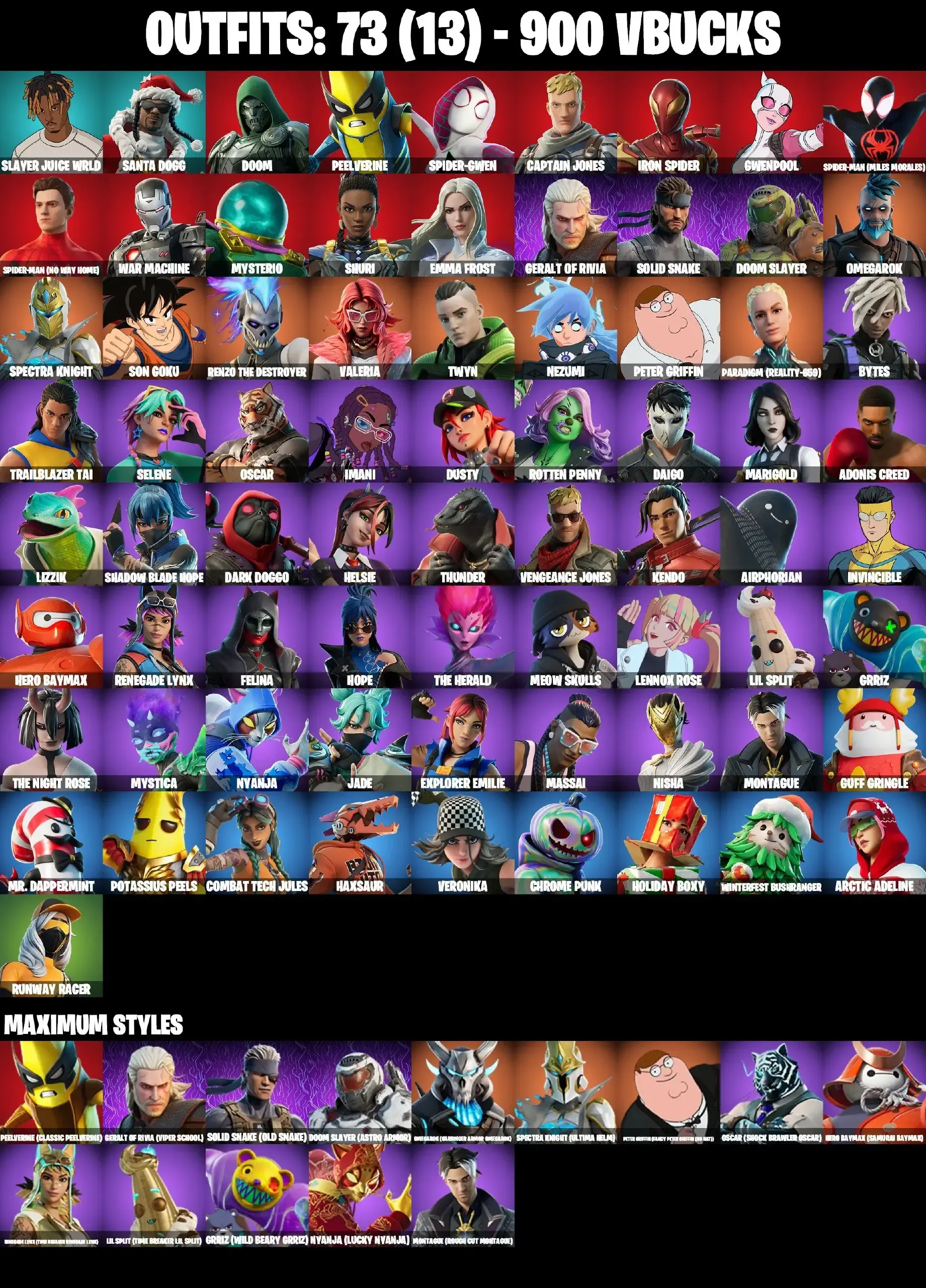 73 SKINS | SPIDER-MAN MILES MORALES | SPIDER-MAN NO WAY HOME | JABBA SWITCHWAY | GET GRIDDY | SON GOKU | INVINCIBLE | HELSIE | COMBAT TECH JULES | MEOW SKULLS | POTASSIUS PEELS | REAPER | CAN PLAY ON PSN,XBOX,PC,NINTENDO,MOB