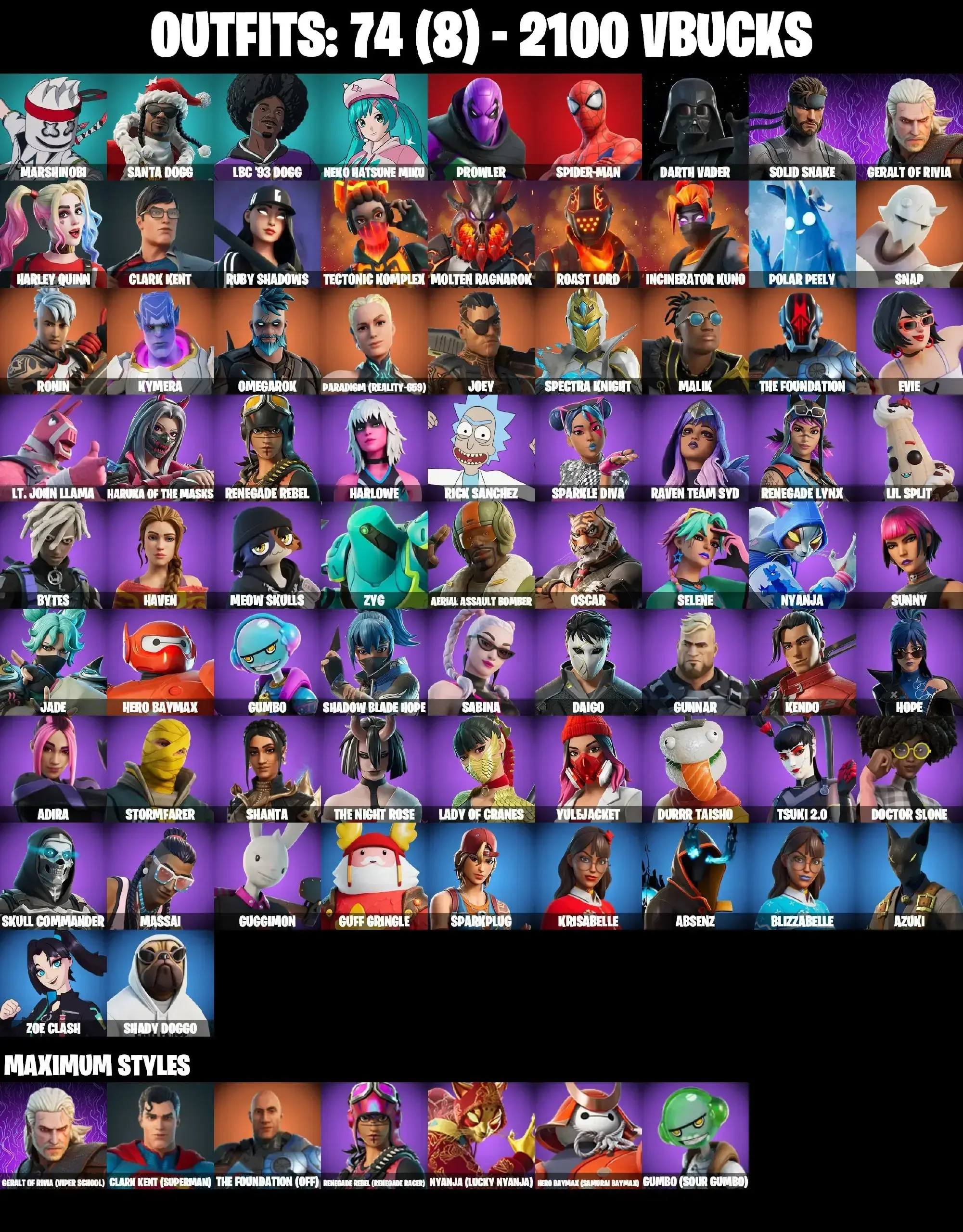 74 SKINS | SHADY DOGGO | SPIDER-MAN | DARTH VADER | HARLEY QUINN | CLARK KENT SUPERMAN | NEKO HATSUNE MIKU | LADY OF CRANES | EVIE | TSUKI 2.0 | DURRR TAISHO | MEOW SKULLS | CAN PLAY ON PSN,XBOX,PC,NINTENDO,MOBILE | 2100 VBUCKS