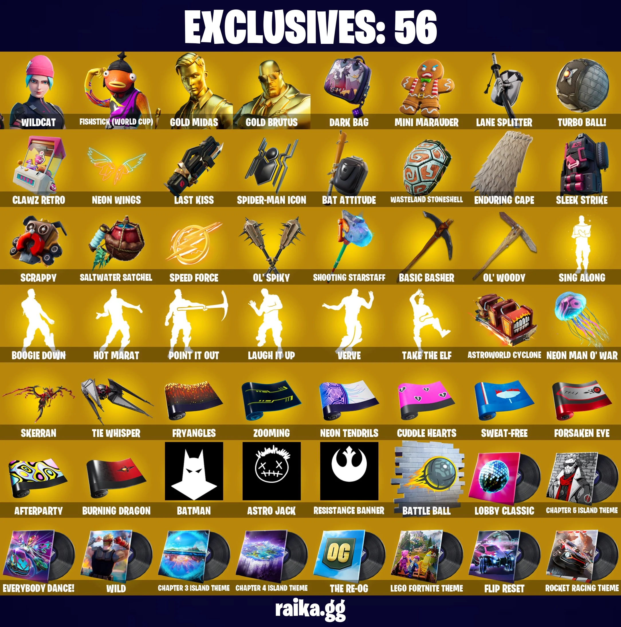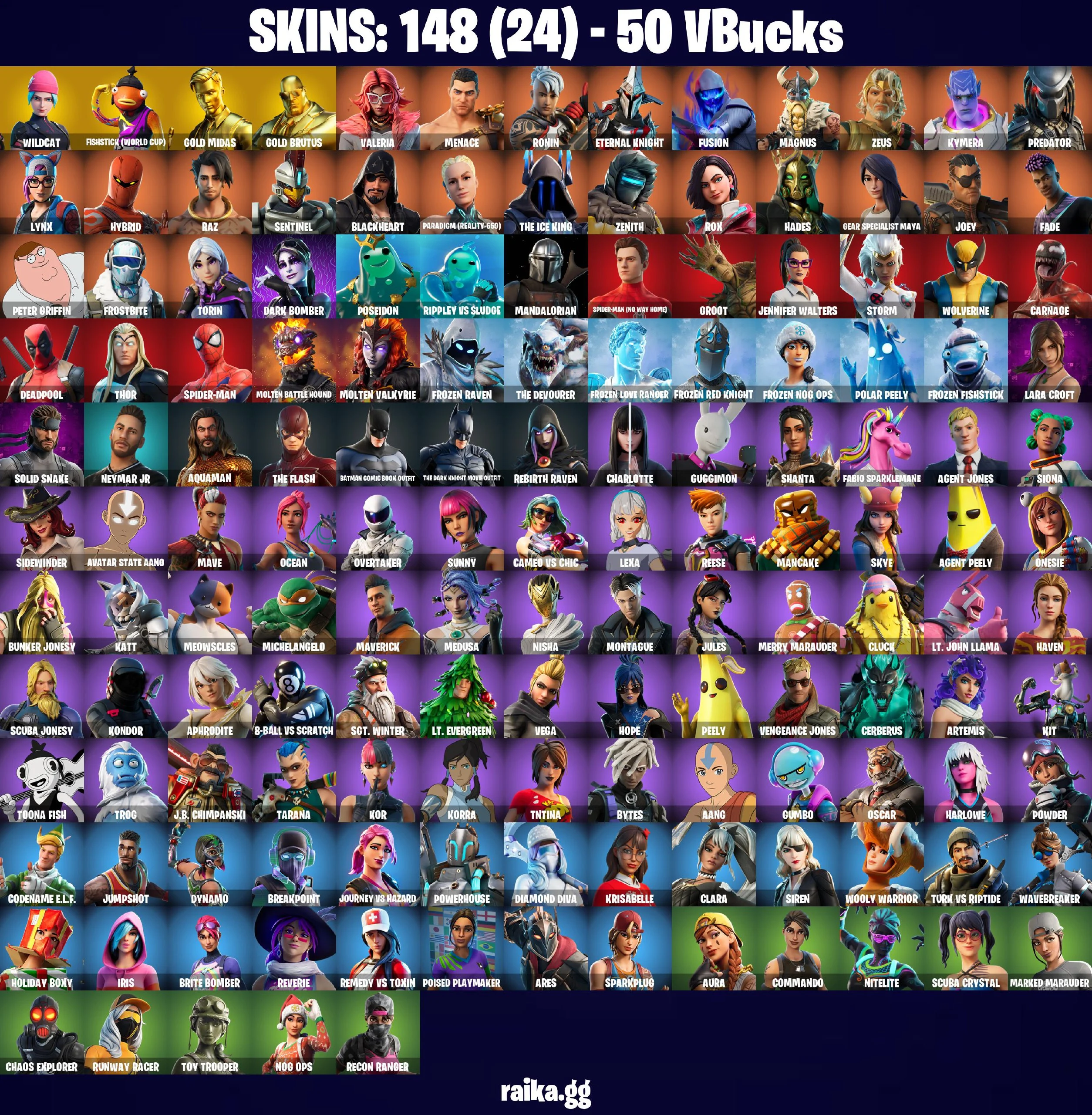 🔥🧨 EXCLUSIVE OFFER 🧨🔥 148 skins 💎 WILDCAT💎 Fishstick (World Cup) 💎 Gold Midas 💎 Gold Brutus 💎 Valeria 💎 Menace 💎 Ronin 💎 Eternal Knight 💎 Fusion 💎 Magnus 💎 Zeus 💎 Kymera 💎 Predator 💎 Lynx 💎 Hybrid 💎 Raz 💎 PC\PSN\XBOX\SWITCH 💎