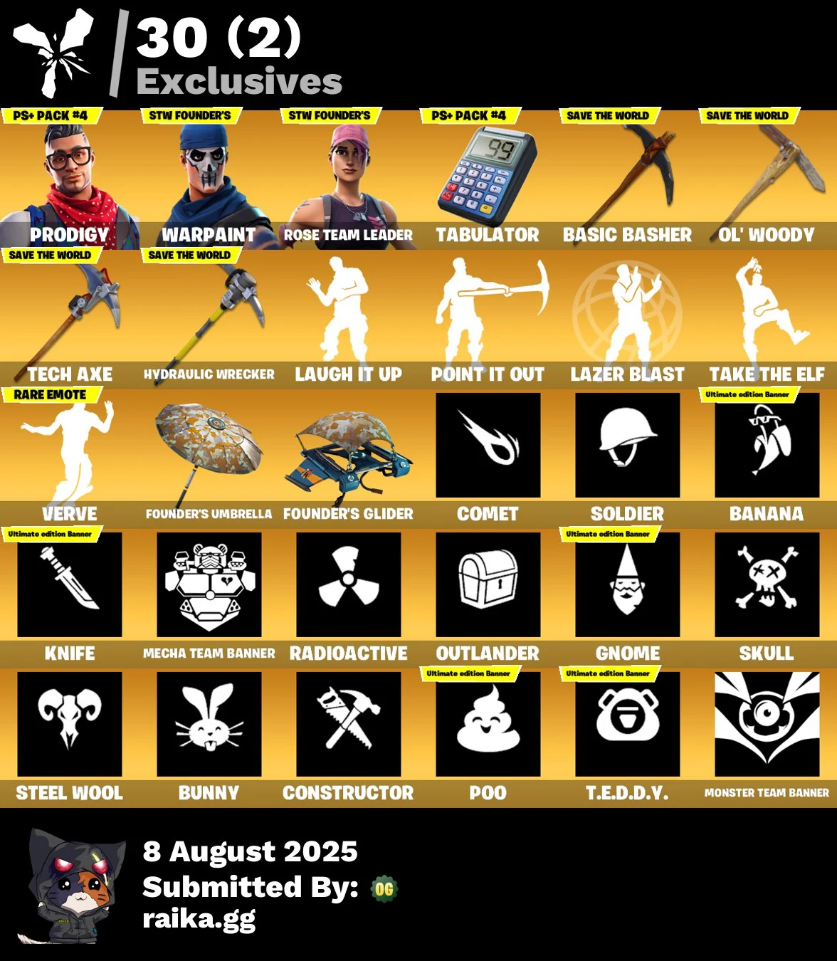 [PC] 80 skins 🎯 OG STW 🎓 Prodigy 🧮 Tabulator ⛏ Basic Basher ⛏ Ol' Woody ⛏ Tech Axe ⛏ Hydraulic Wrecker 😂 Laugh It Up 👉 Point It Out 🔫 Lazer Blast 💰 480 VB