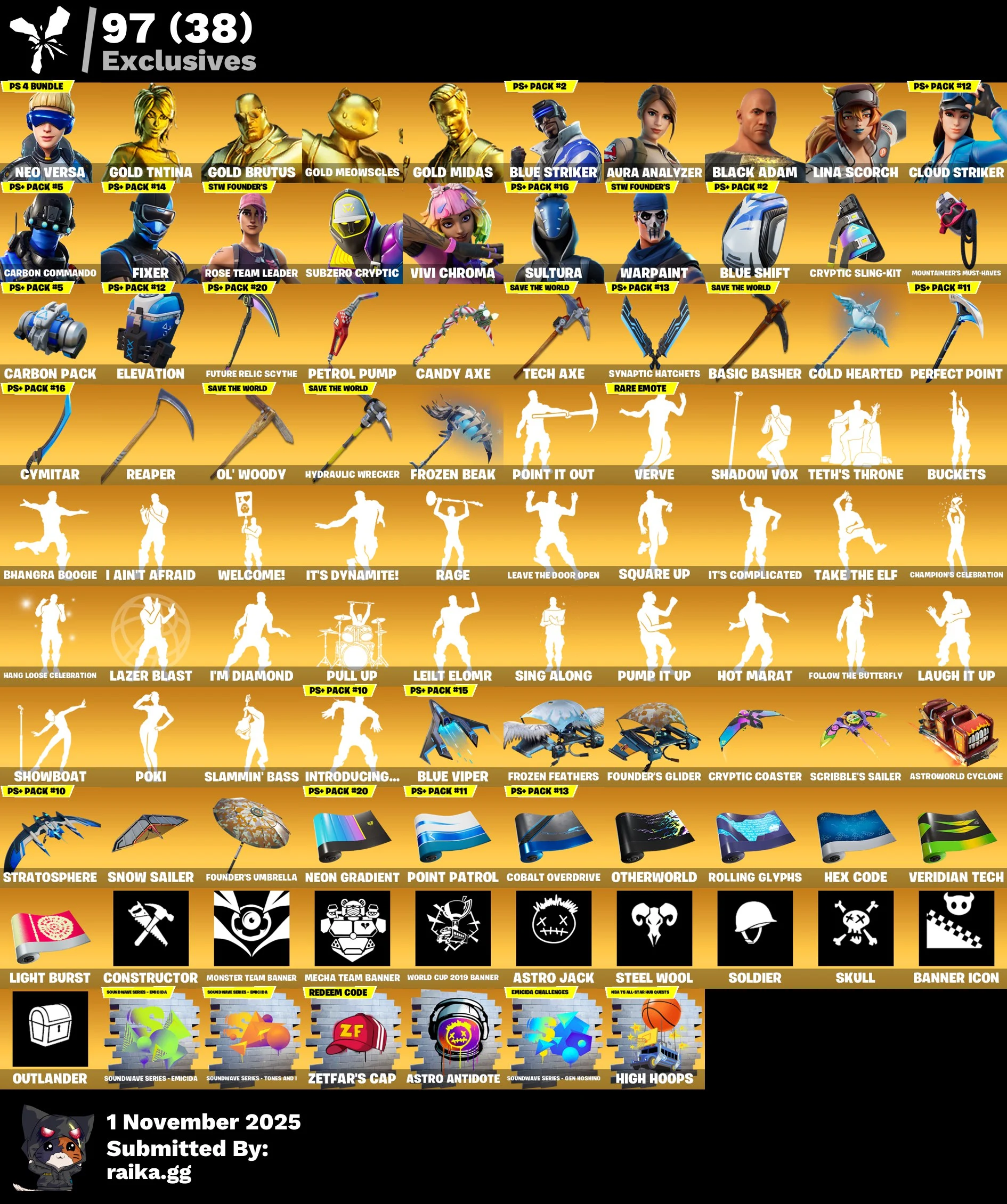 [PC | PSN | XBOX] 362 skins | OG Save The World | Renegade Raider | Neo Versa | Gold TNTina | Gold Brutus | Gold Meowscles | Gold Midas | Candy Axe | Black Adam | Blue Striker | Aura Analyzer | 50 VB