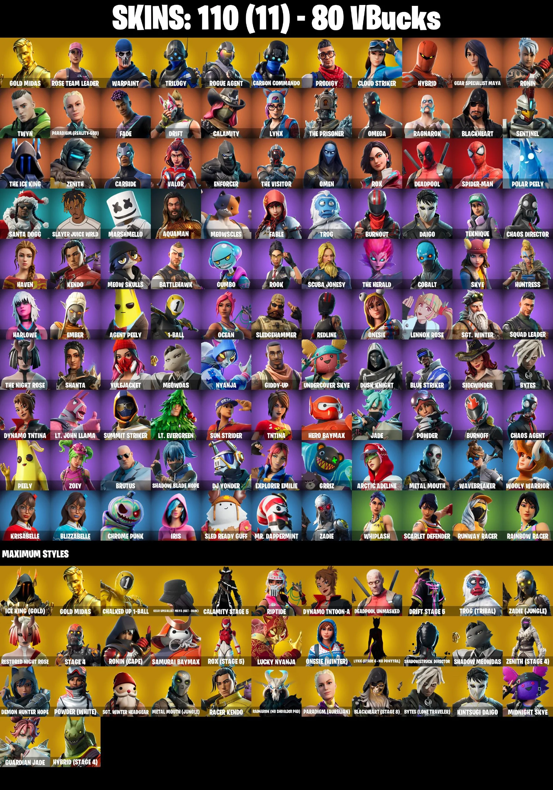 (PC/PSN) 80 VB) 110 SKINS / GOLD MIDAS / TRILOGY / ROGUE AGENT / CARBON COMMANDO / PRODIGY / CLOUD STRIKER / HYBRID / GEAR SPECIALIST MAYA / RONIN /