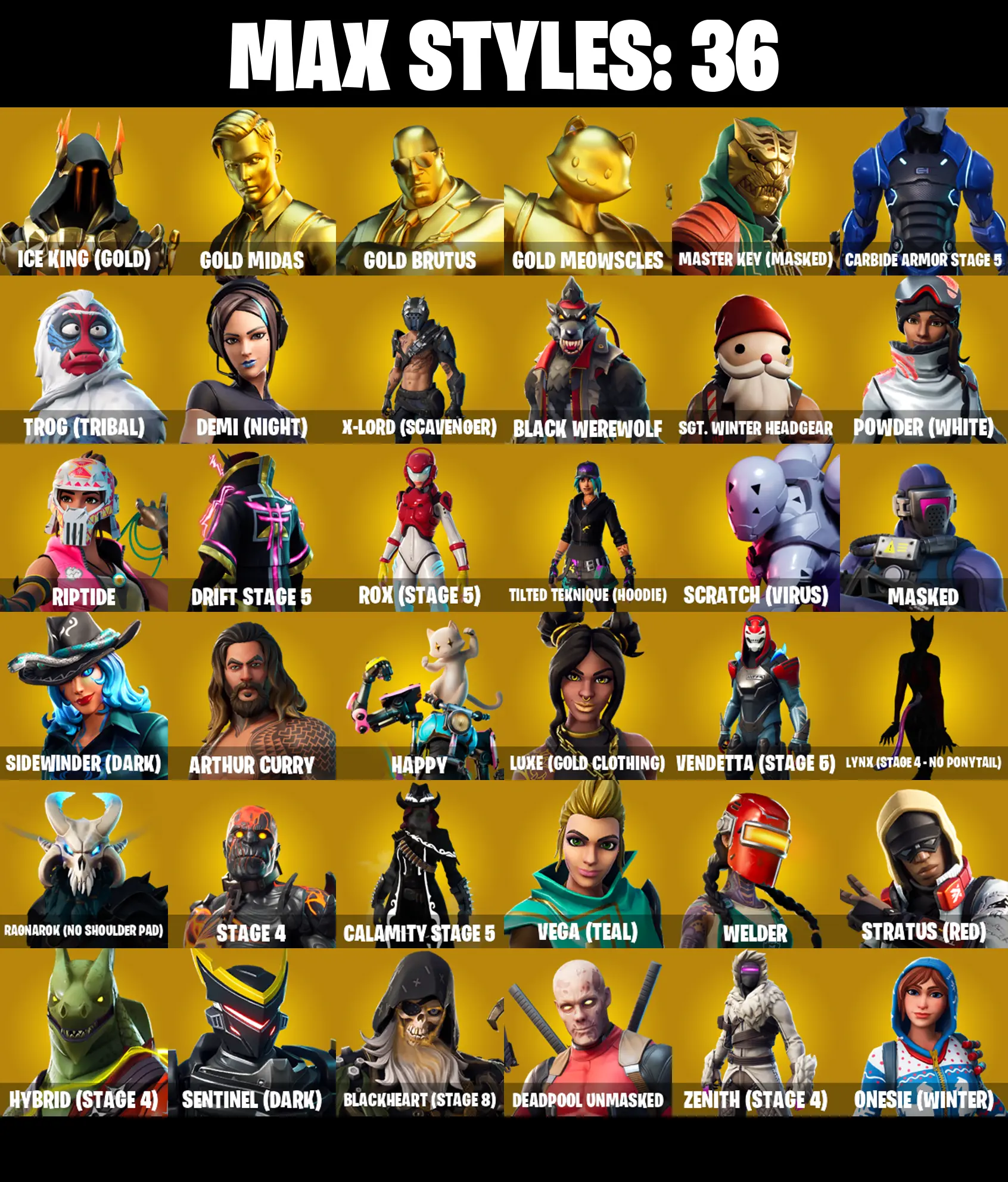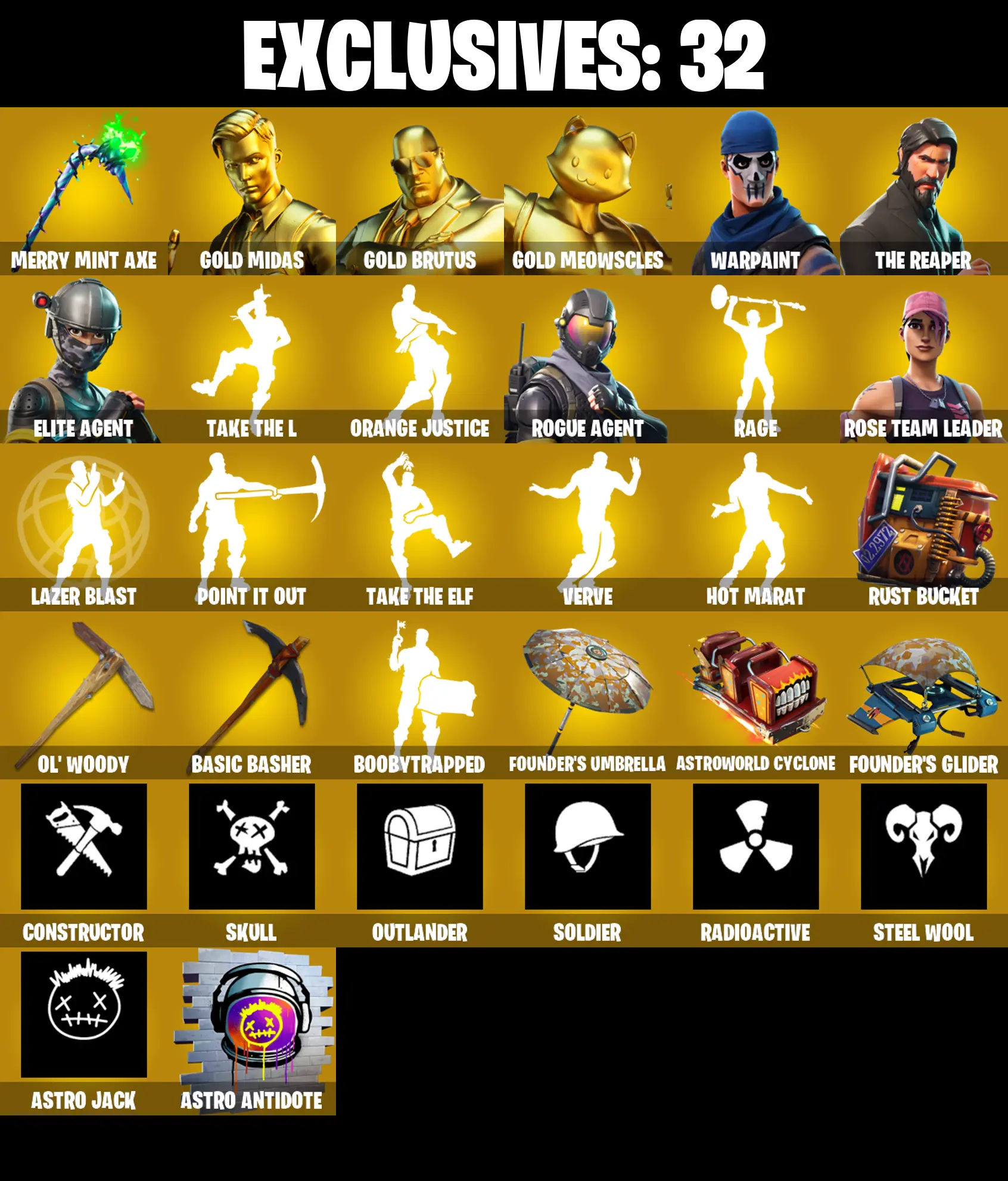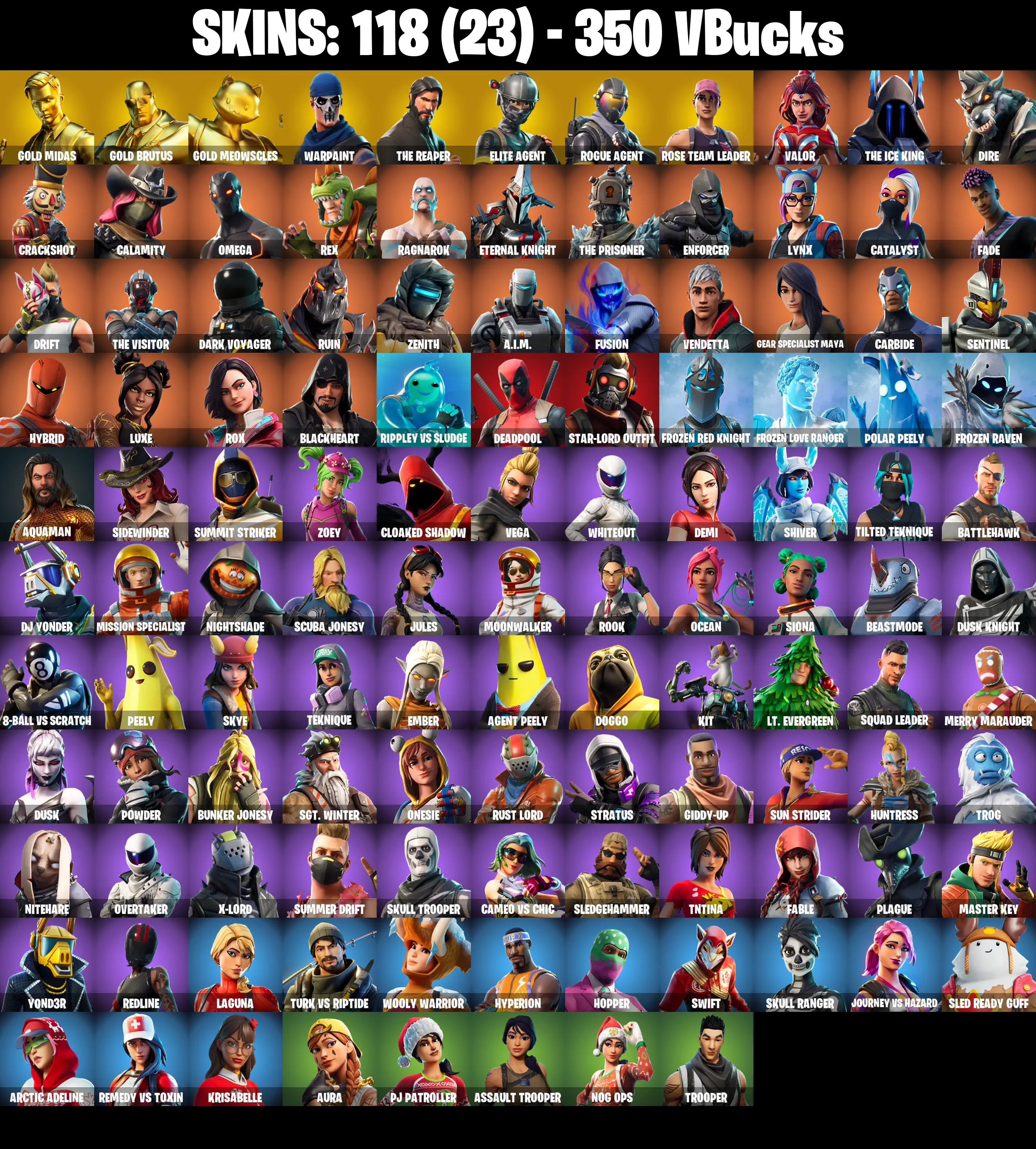 PC/PSN/XBOX ♨️118 skins ✨ OG STW ✨ Merry Mint Axe ✨ Deadpool ✨ Gold Midas ✨ Gold Brutus ✨ Gold Meowscles ✨ The Reaper ✨ Elite Agent ✨ Omega ✨ #B768