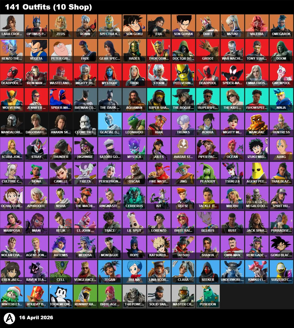 | PC/PSN/XBOX | 141 Skins | Leviathan Axe | Lara Croft | Super Shaq | The Rogue LAROI | ISuperSpeed | The Kid LAROI | IShowSpeed | Ninja | Optimus Prime | Zeus | Ronin | Spectra Knight | Son Goku | ...