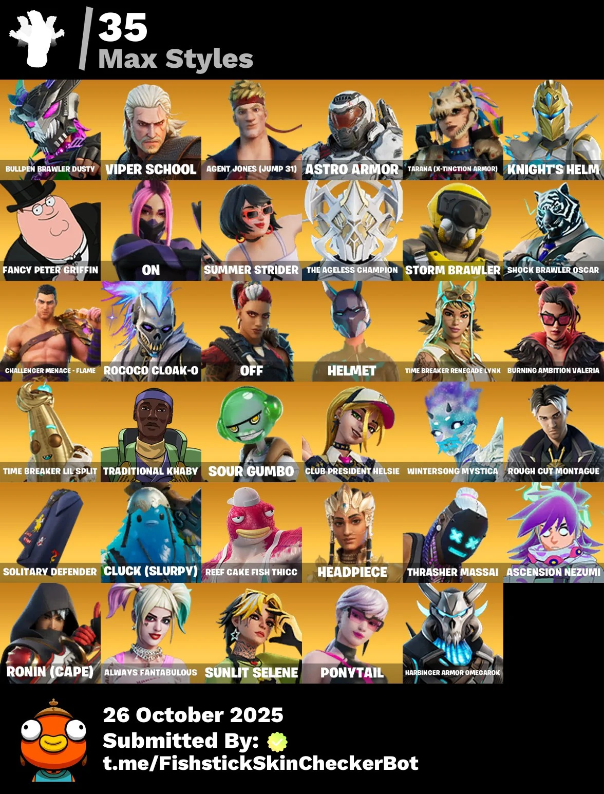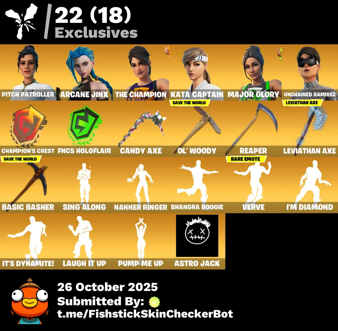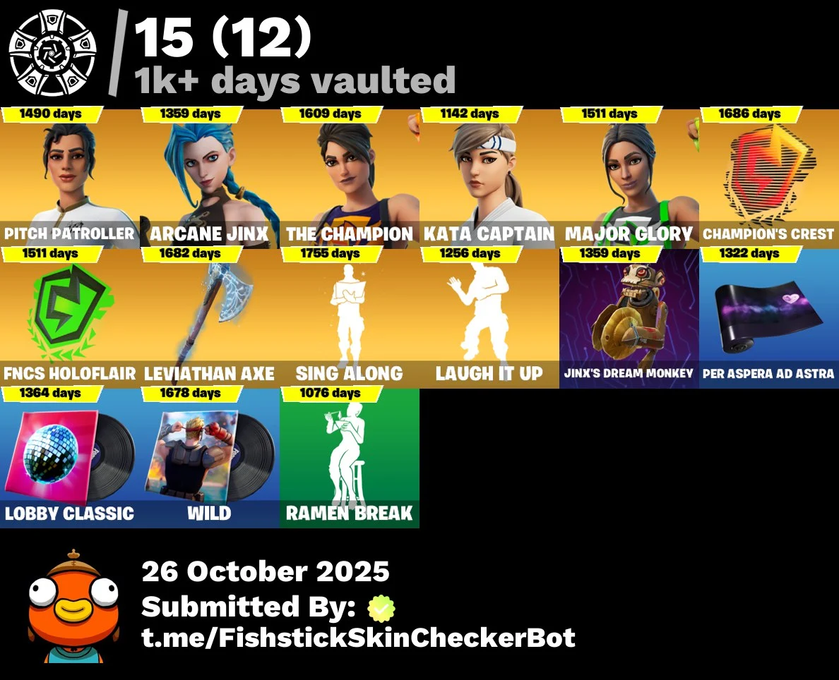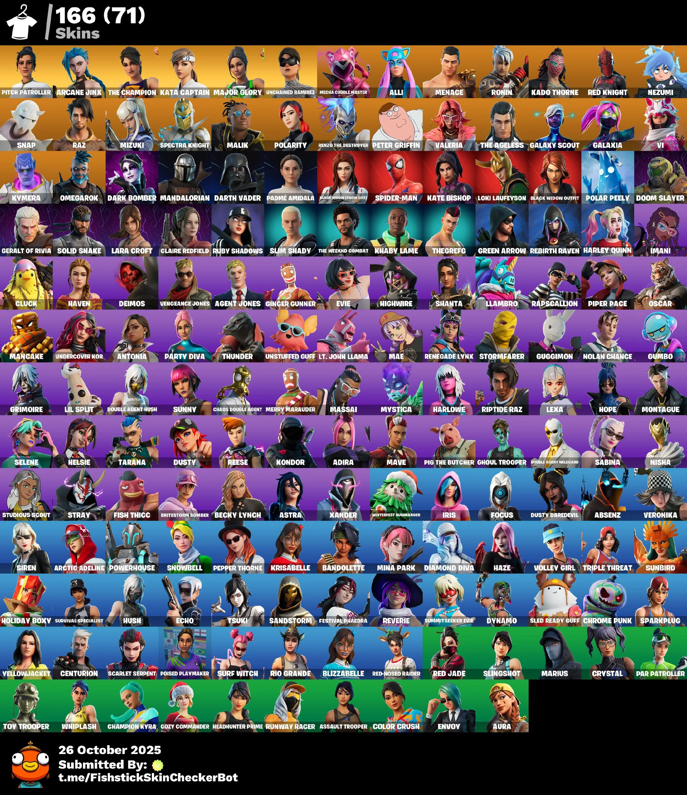 [PC/PSN/XBOX] 166 skins | Arcane Jinx | Leviathan Axe | Claire Redfield | | Unchained Ramirez | The Champion | Kata Captain | Major Glory | | Pitch Patroller | Mecha Cuddle Master | Alli | Menace | 400 VB