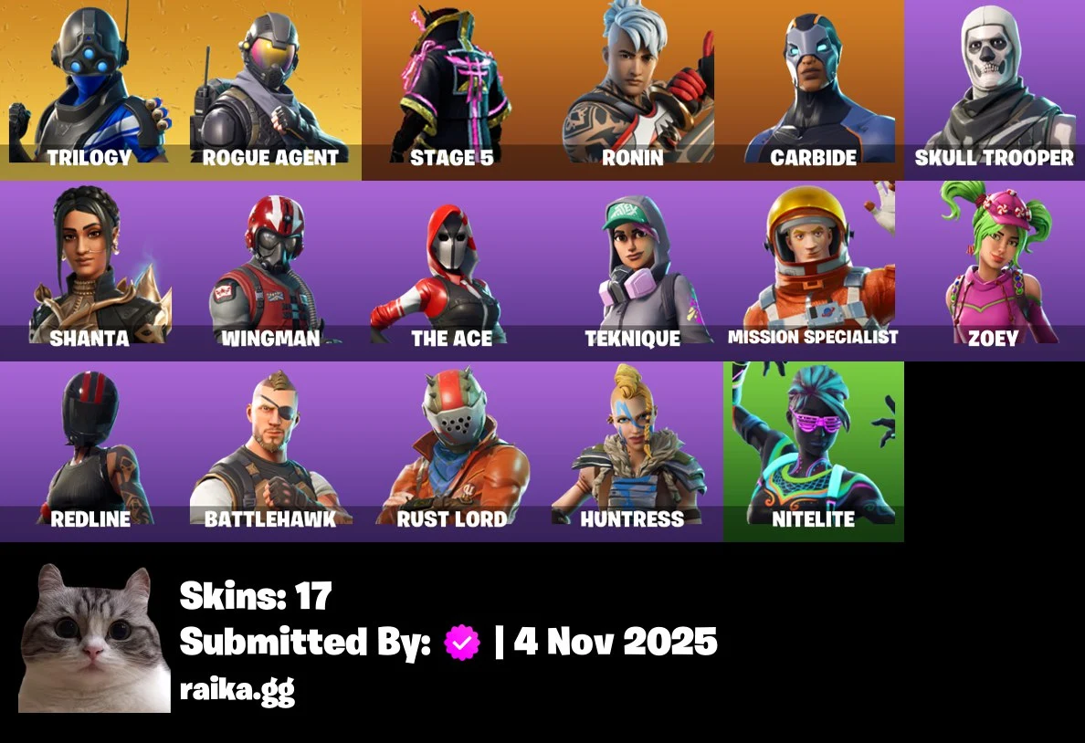 [PC/PSN/XBOX] 17 skins | Trilogy | Rogue Agent | STAGE 5 | Ronin | Carbide | Skull Trooper | Shanta | Wingman | The Ace | Teknique | Mission Specialis