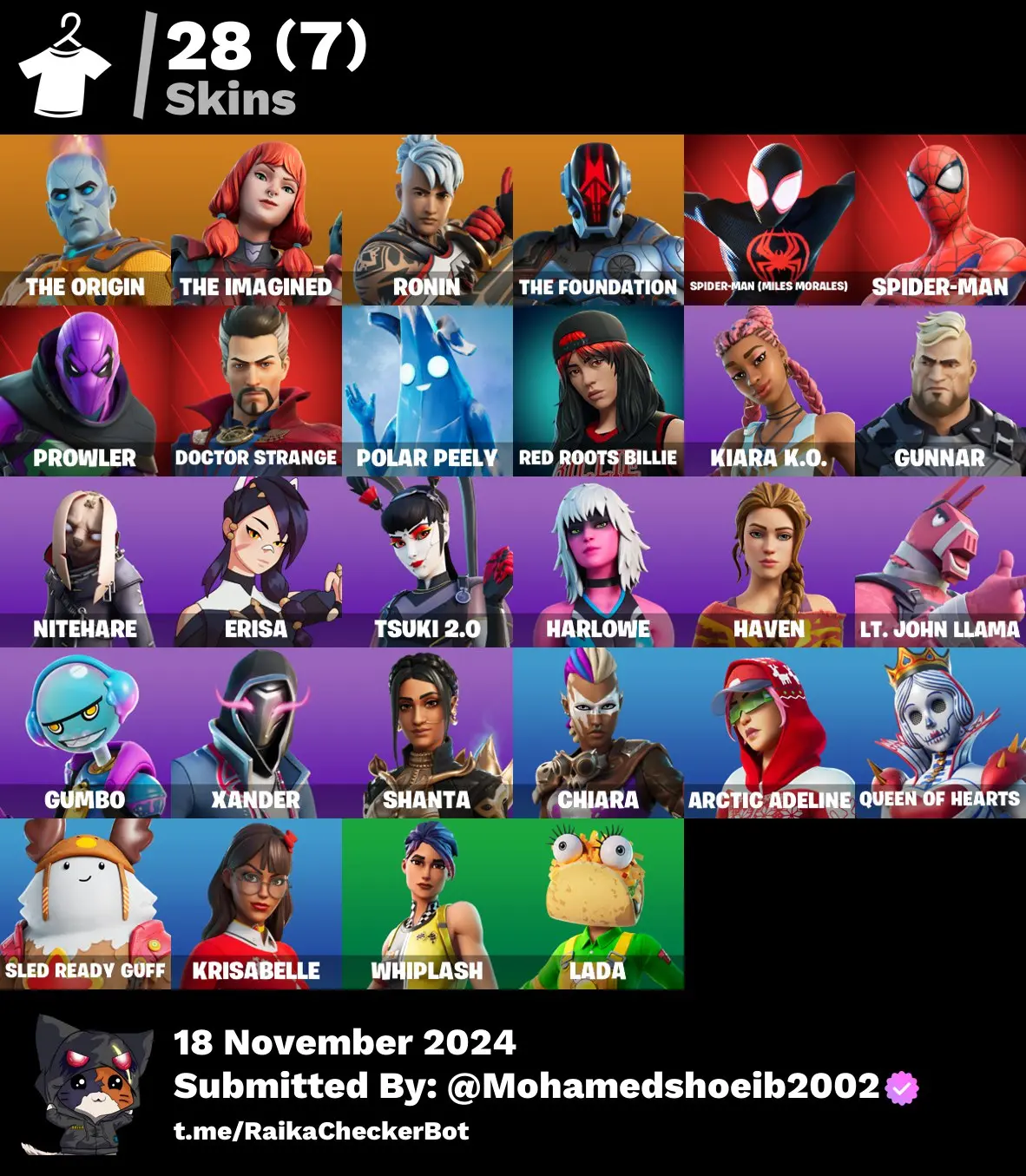[PC/PSN/XBOX] 28 skins | The Origin | The Imagined | Ronin | The Foundation | Spider-Man (Miles Morales) | Spider-Man | Prowler | Doctor Strange | Polar Peely | 0 VB