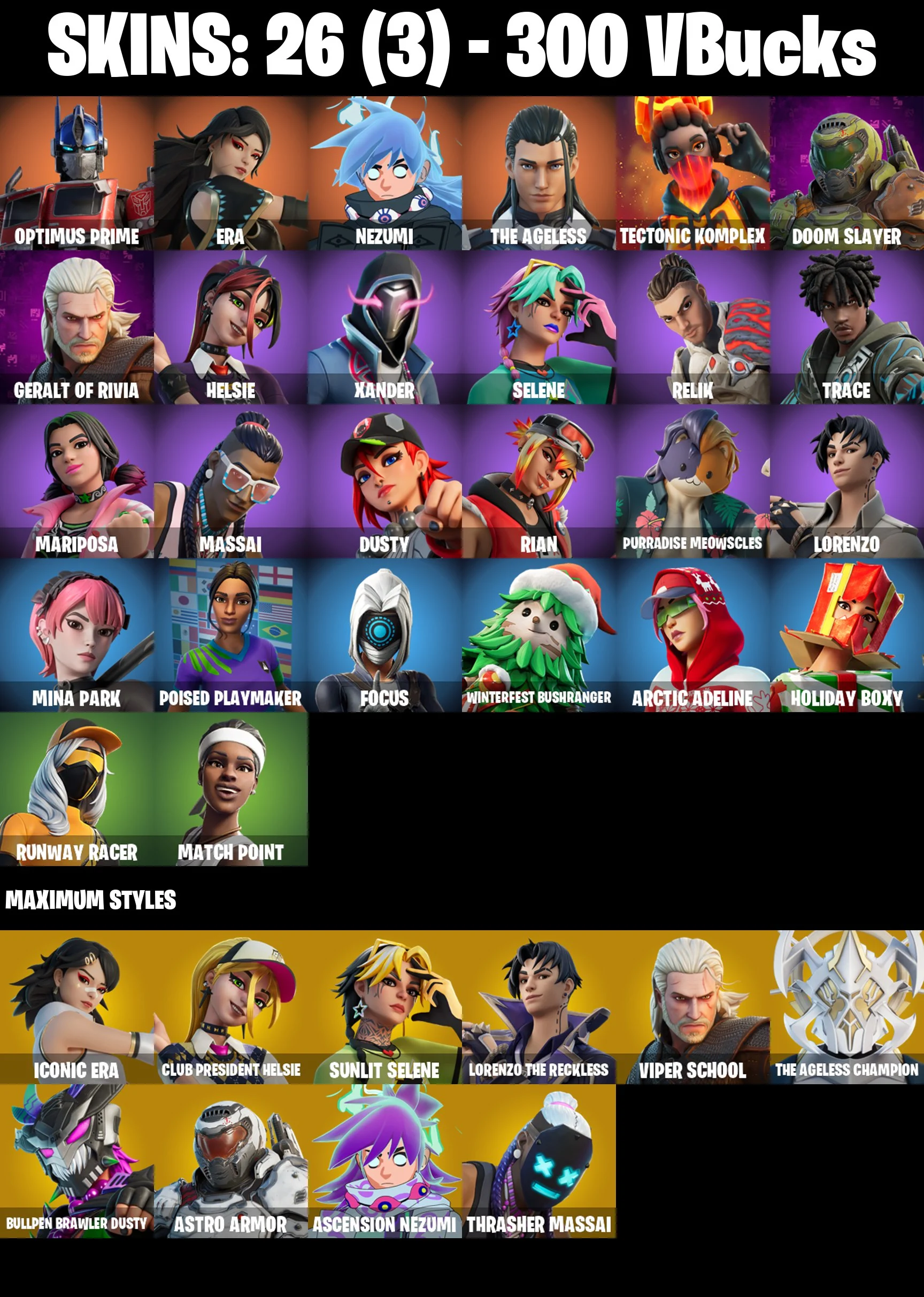 (PC/PSN/XBOX) 300 VB) 26 SKINS / OPTIMUS PRIME / ERA / NEZUMI / THE AGELESS / TECTONIC KOMPLEX / DOOM SLAYER / GERALT OF RIVIA / HELSIE /