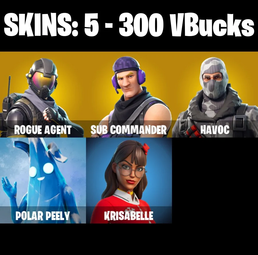 (PC/PSN/XBOX) 300 VB) 5 SKINS / ROGUE AGENT / SUB COMMANDER / HAVOC / POLAR PEELY / KRISABELLE / BACKUP PLAN / COZY CONCH / AWR PACK /