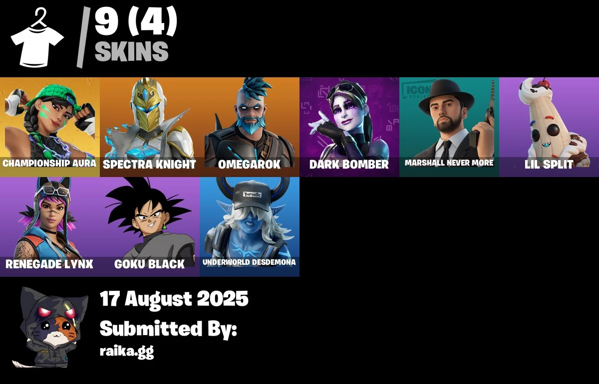 [PC/PSN/XBOX] 9 skins | Championship Aura | Future Relic Scythe | Spectra Knight | Omegarok | Dark Bomber | Marshall Never More | Lil Split | Renegade Lynx | 100 VB