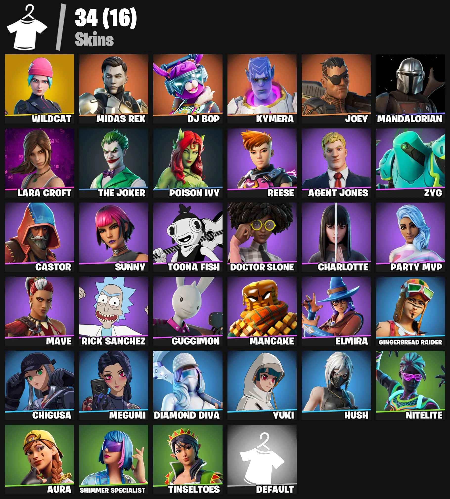 PC/PS/XBOX/SWITCH | 34 Skins | Wildcat | Midas Rex | DJ Bop | Kymera | Joey | Mandalorian | Lara Croft | The Joker | Poison Ivy | Reese | Agent Jones | Zyg | Castor | 0 VB