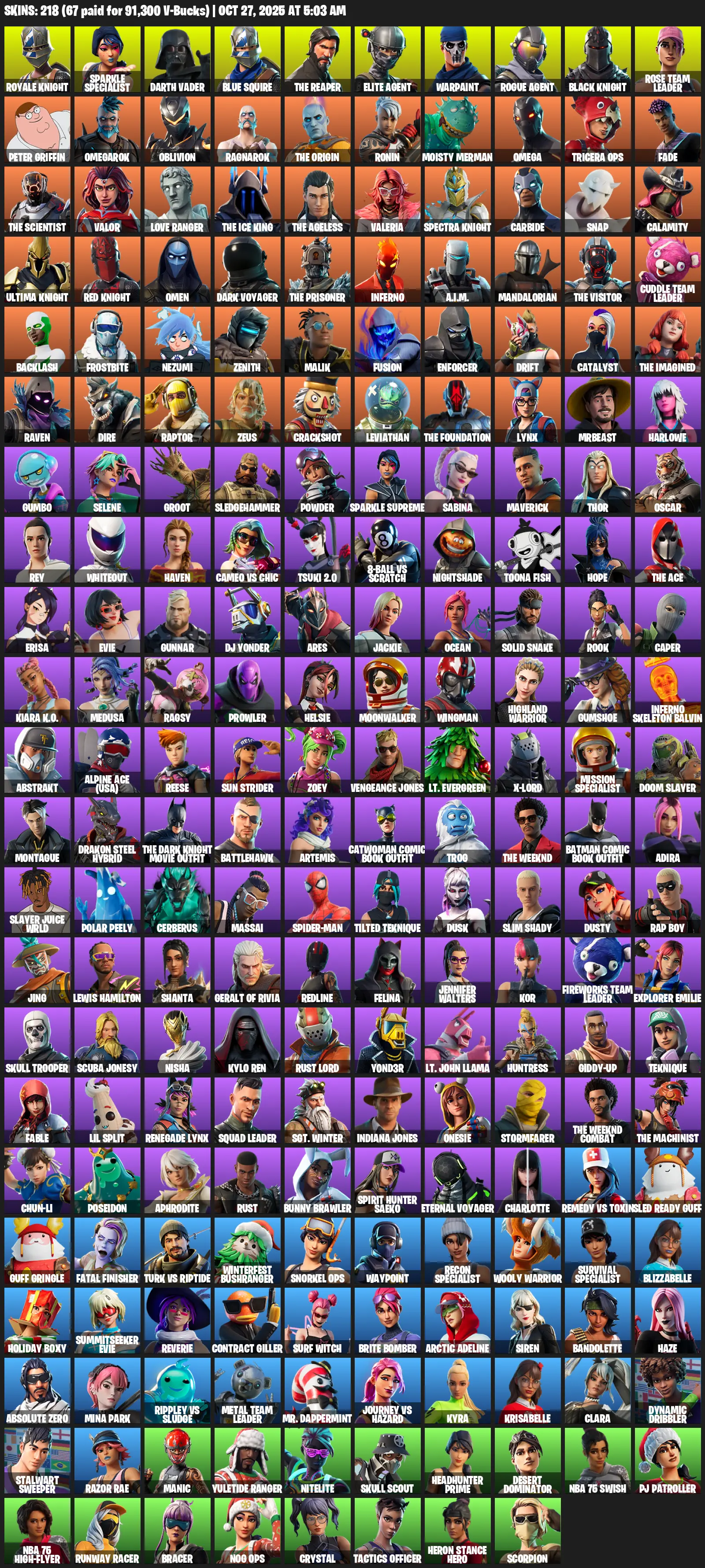 [PC/XBOX/PSN] 218 Skins | Royale Knight | Sparkle Specialist | Darth Vader | Blue Squire | The Reaper | Elite Agent | Warpaint | Rogue Agent | Black Knight | Rose Team Leader | Peter Griffin | Omegarok | Oblivion | Ragnarok | The Origin | Ronin