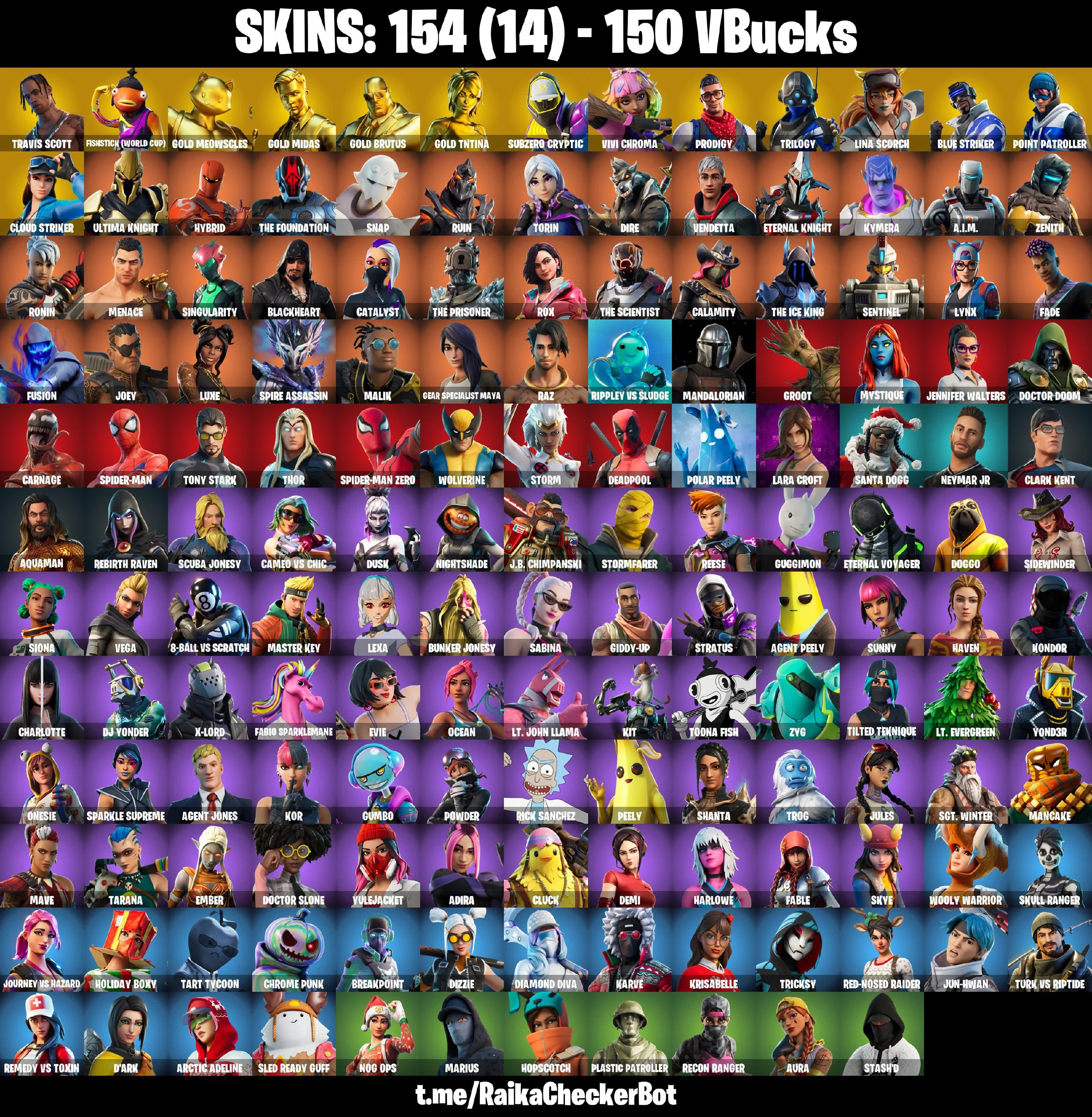 🎁✨ RARE ACCOUNT ✨🎁 154 SKINS 🌟 TRAVIS SCOTT 🌟 FISHSTICK (WORLD CUP) 🌟 GOLD MEOWSCLES 🌟 GOLD MIDAS 🌟 GOLD BRUTUS 🌟 GOLD TNTINA 🌟 SUBZERO CRYPTIC 🌟 VIVI CHROMA 🌟 150 VB 🌟 PSN/XBOX/PC