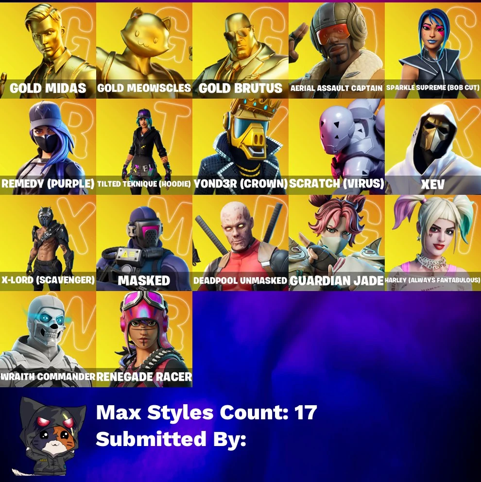 ๐๐ฅ STACKED ACCOUNT ๐ฅ๐ 154 SKINS ๐ RAIDER'S REVENGE ๐ GOLD MIDAS ๐ GOLD MEOWSCLES ๐ GOLD BRUTUS ๐ SPIKE ๐ GRIDIRON ๐ RUSH ๐ BLITZ ๐ END ZONE ๐ STRONG GUARD ๐ JUKE ๐ INTERCEPTOR ๐ BHANGRA BOOGIE ๐ VERVE ๐ RAGE ๐ ASTROWORLD CYCLONE ๐ 590 VB ๐ FULL ACCESS ๐