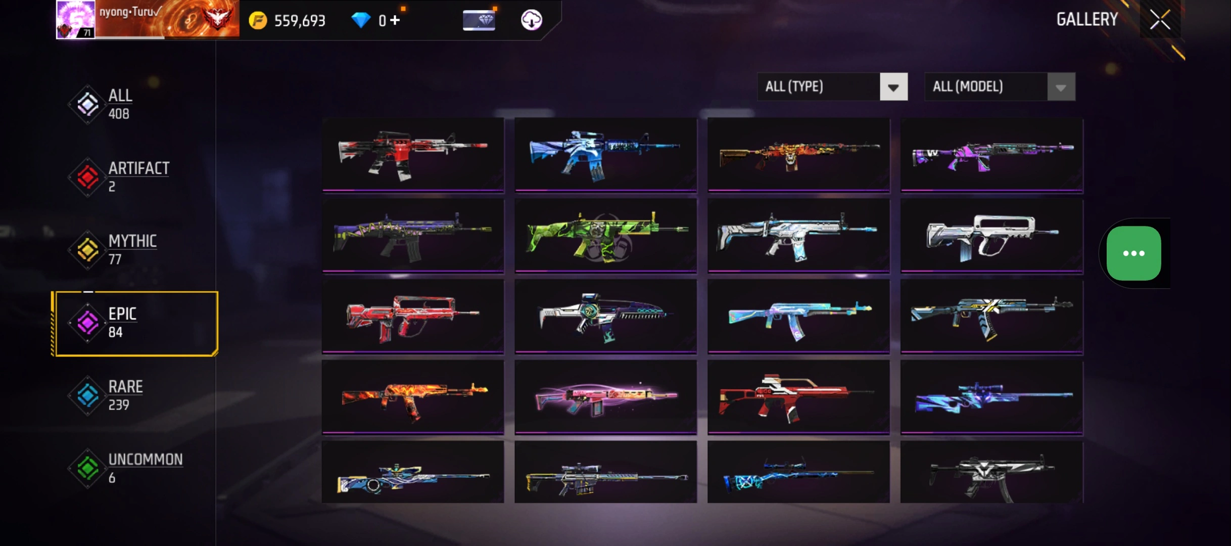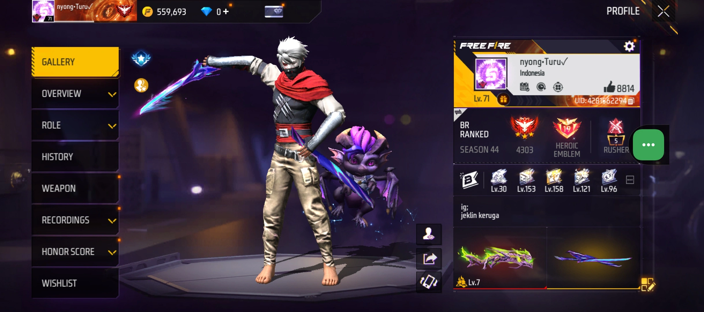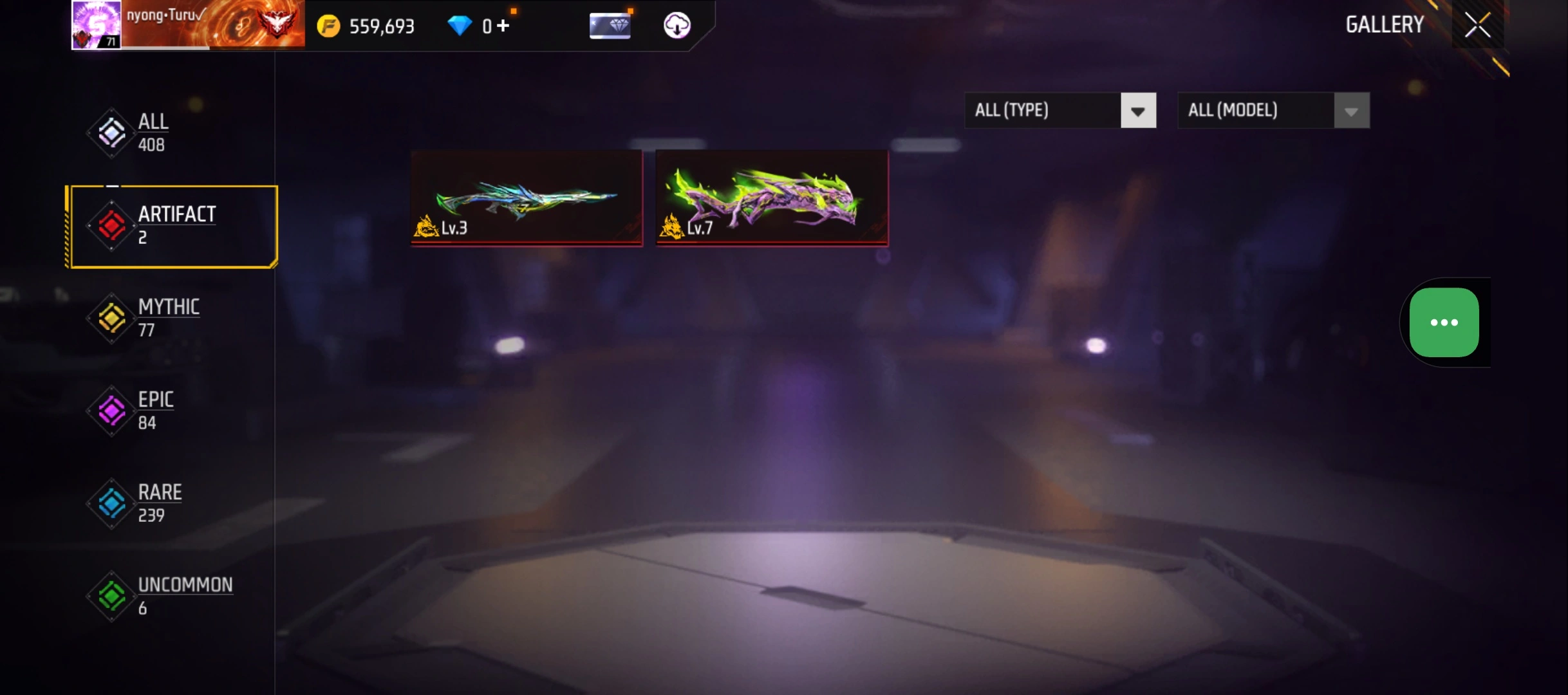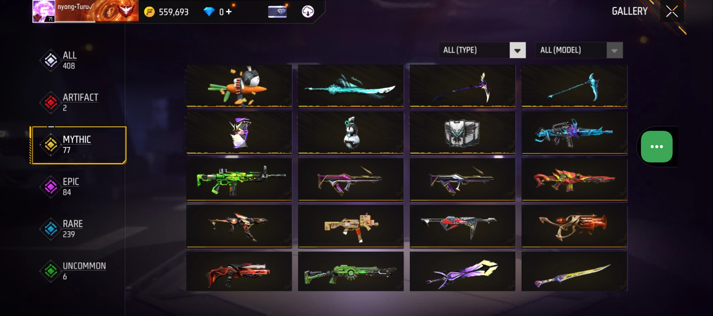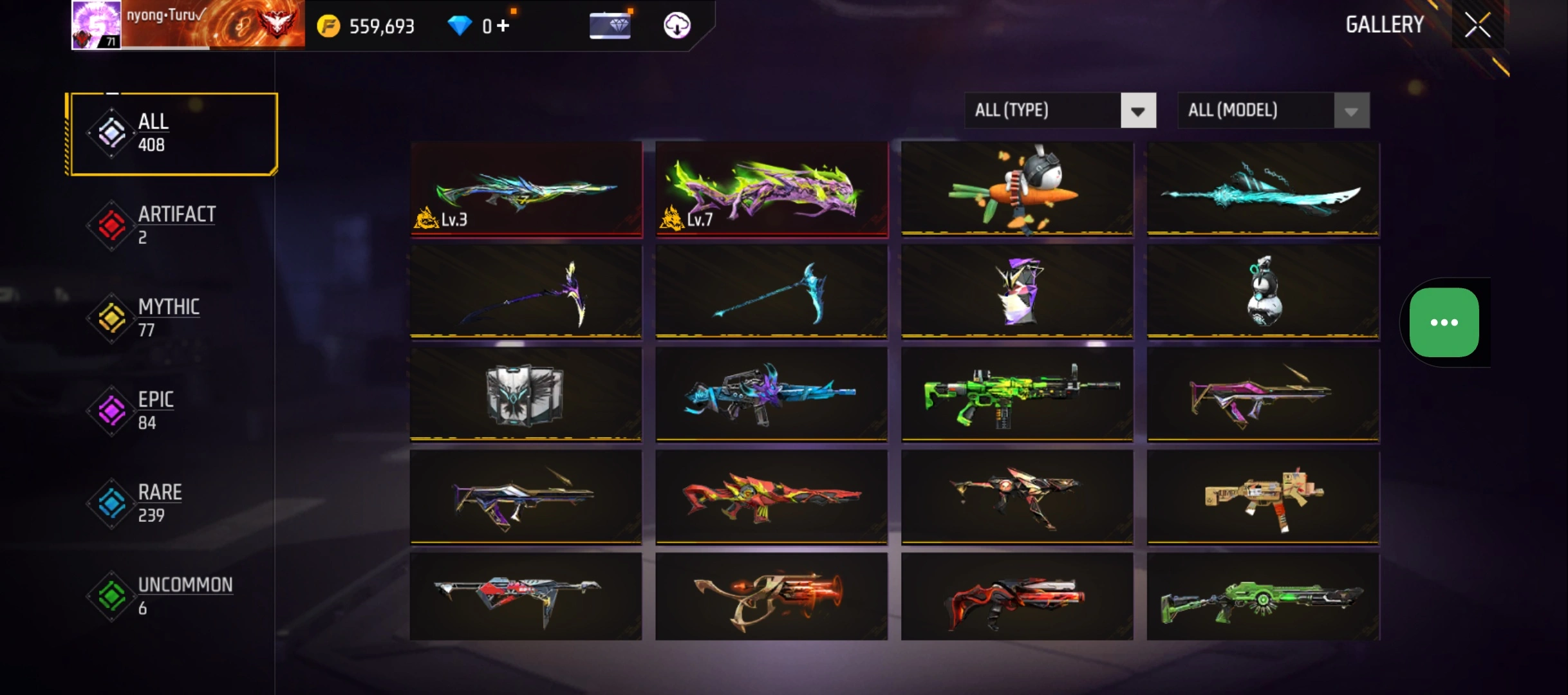 B23|LV71/408 WEAPON (2 EVO + 77 Mythic)/M1014 ⸱ Green Flame Draco Lv. Max/PARAFAL ⸱ Lore Cyclone Lv. 3/365 COSTUME (19 Mythic)/55 EMOT (1 Artifact + 19 Mythic)/77 BACKPACK (5 Artifact + 34 Mythic)/9 SPORTS CAR (2 Mythic)