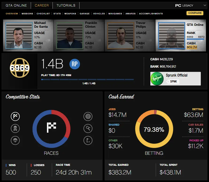 SOCIAL CLUB / ROCKSTAR / PC / LEGACY | $69.2M PURE CASH | RP level 6969 | MALE OR FEMALE | STORY MODE avaliable | Changable Email | HANDCRAFTED
