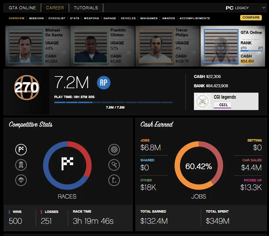 SOCIAL CLUB / ROCKSTAR / PC / LEGACY | $84.4M PURE CASH | RP level 270 | MALE OR FEMALE | STORY MODE avaliable | Changable Email | HANDCRAFTED