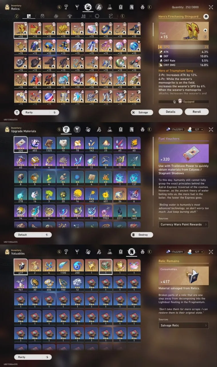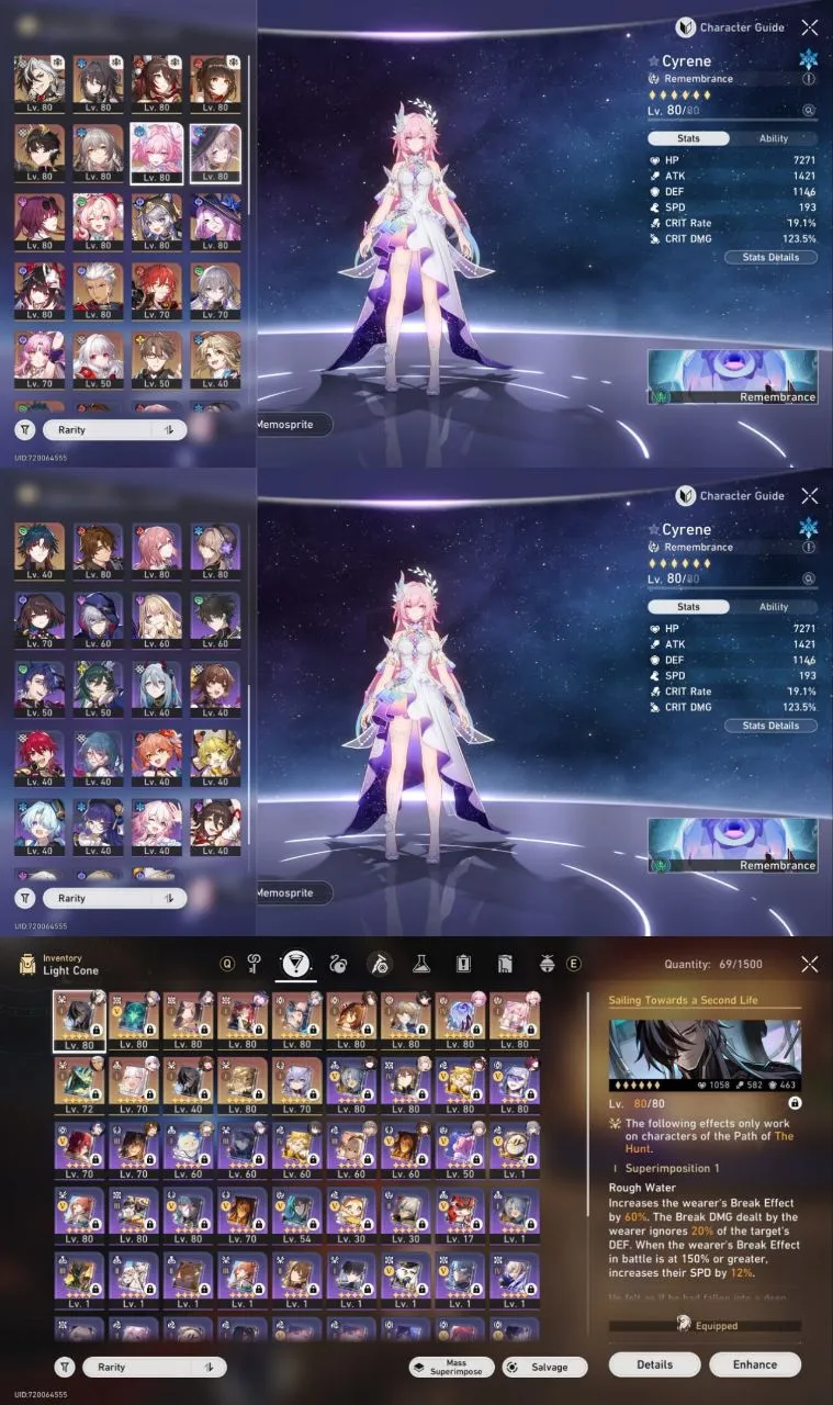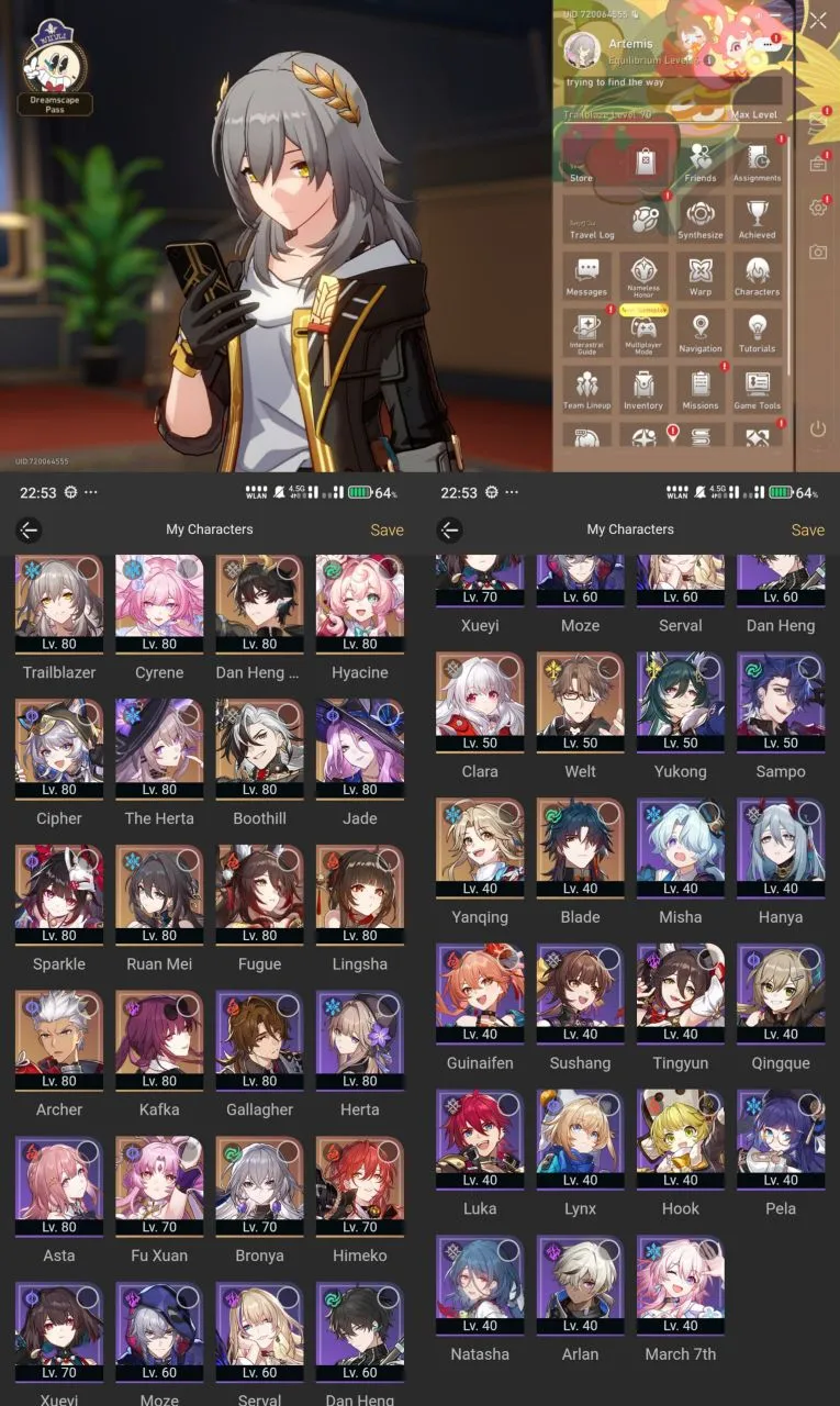 All Platform 🎮 EU 🛍️ Level70 🔥 43 Character 21 5'Star 🌟 14 Weapon 5'Star 🔫 Cyrene 🎯 The Herta 💯 Jade 🌹 Hyacine 🏆 Cipher 🏹 Code1221